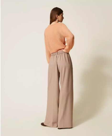 Fit: Palazzo com cintura média, fecho de correr e botão, vinco frontal vincado