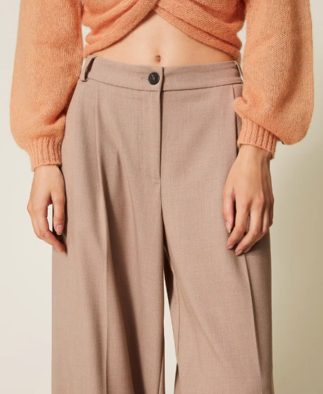 Fit: Palazzo, mid-waist, zip and button fastening, pressed crease