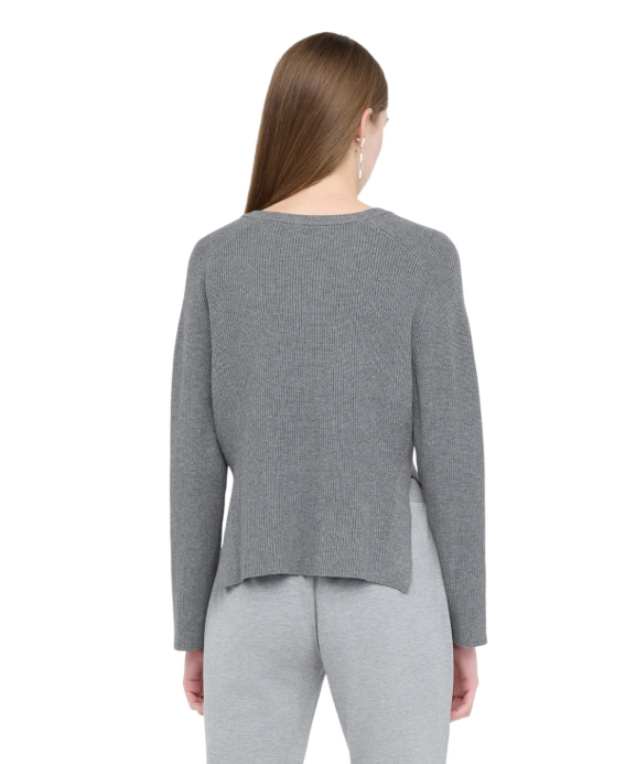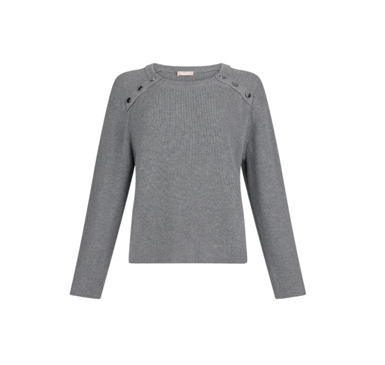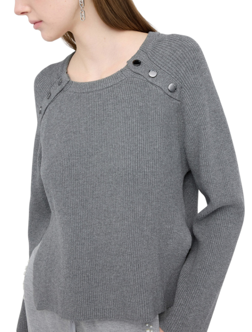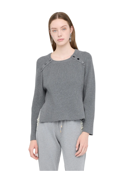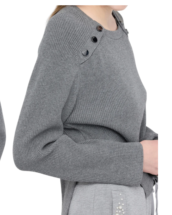 EN: Soft viscose knit with a crew neck and long sleeves. The metallic button detail on the shoulders adds a subtle yet modern charm, while the ribbed texture and straight cut provide comfort and understated elegance. Perfect for both sophisticated looks and elevated casual wear.