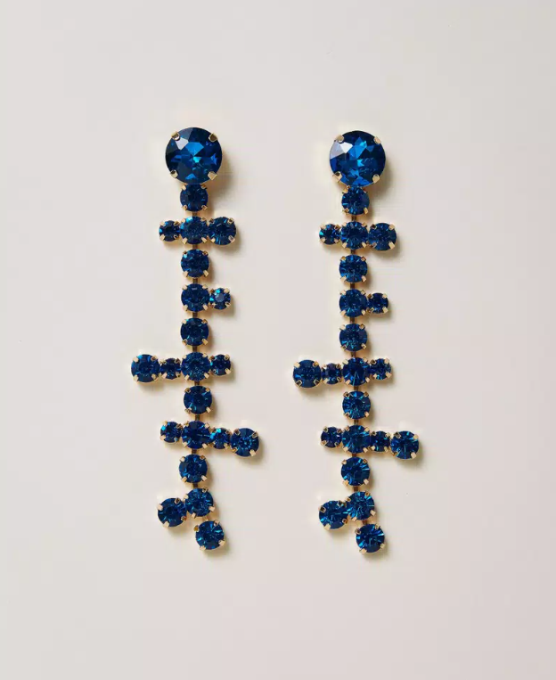 Long drop earrings in sapphire blue crystals, with a sculptural design and shiny finish. A statement piece that lights up any outfit, adding both boldness and sophistication.