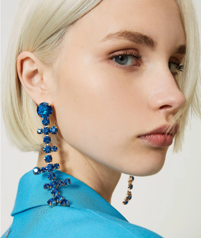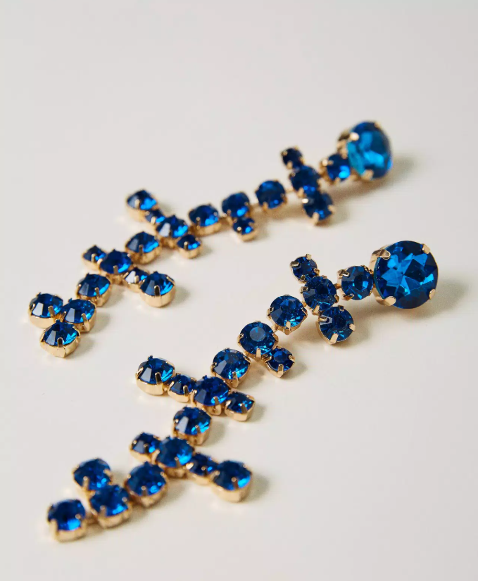 Brincos compridos em cristais azul safira, de design escultural e acabamento brilhante. Uma peça statement que ilumina qualquer coordenado, transformando o look com ousadia e sofisticação.