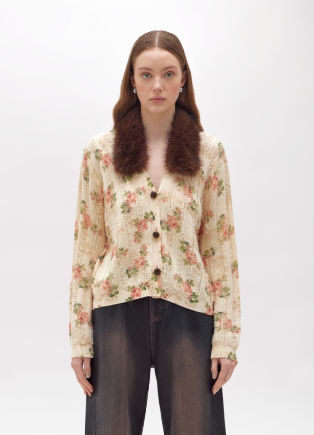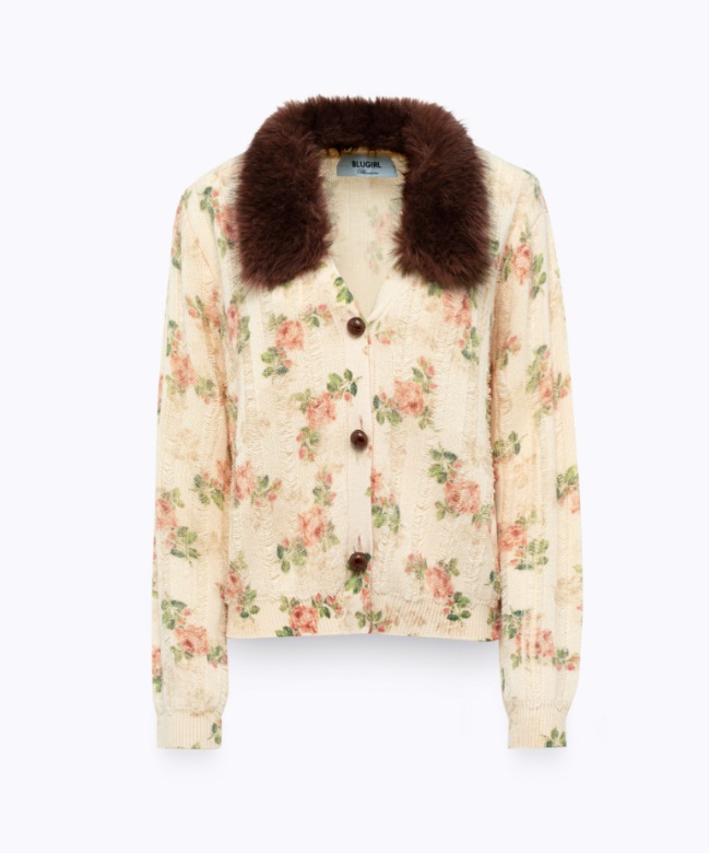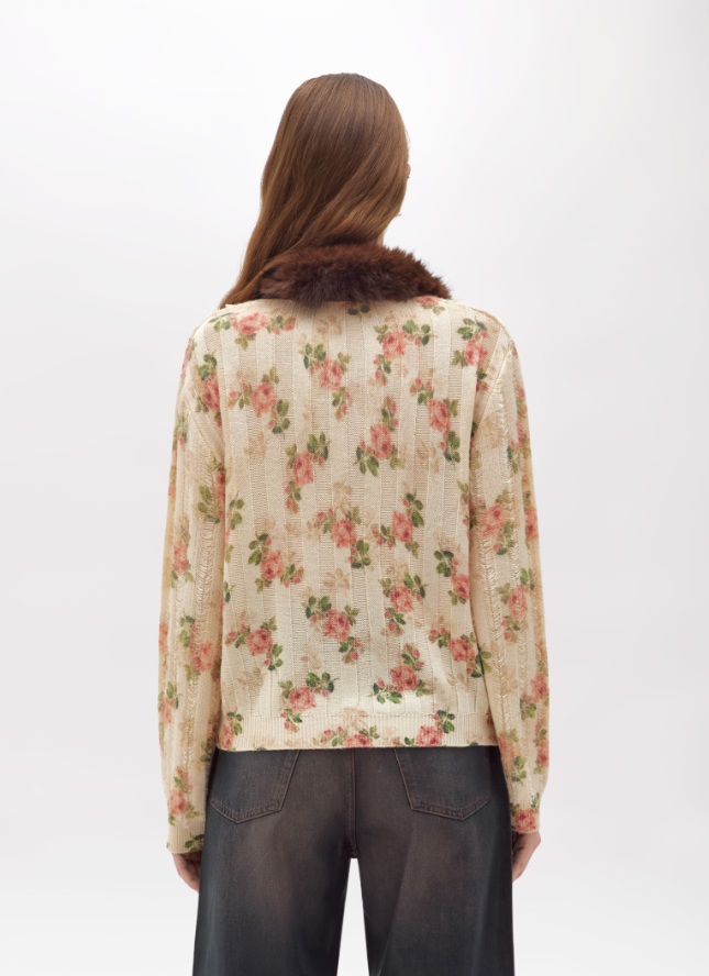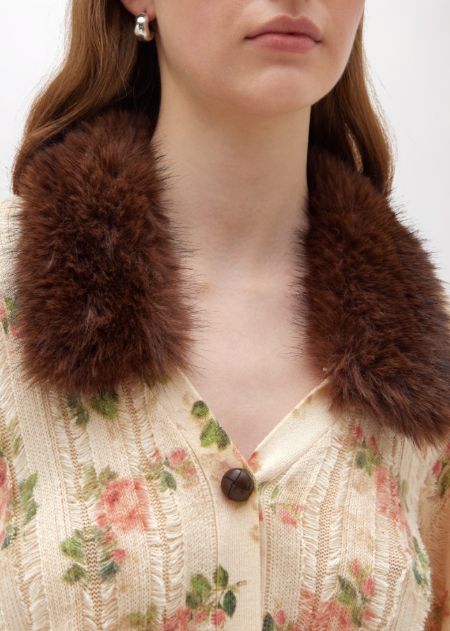 Add a graphic touch to your look with this ribbed wool-blend cardigan, featuring floating threads and a rose print. Made unique by the iconic removable faux fur collar, it has a covered button closure for a loden effect, long sleeves, and a soft silhouette. Perfect for day-to-night outfits.