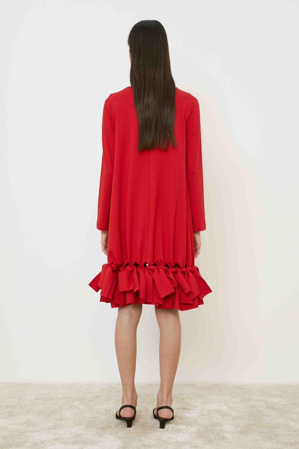 A vibrant red dress with a clean, fluid cut and a sculptural bow detail at the hem. Minimalist on the body and dramatic at the base, it delivers presence with refined restraint.