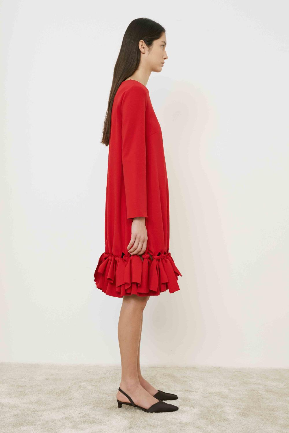 Um vestido vermelho vibrante, com corte limpo e fluido, que ganha personalidade no detalhe escultórico de laços aplicados na bainha. Uma peça que equilibra minimalismo no corpo e dramatização controlada na base — perfeito para quem gosta de presença sem exageros.