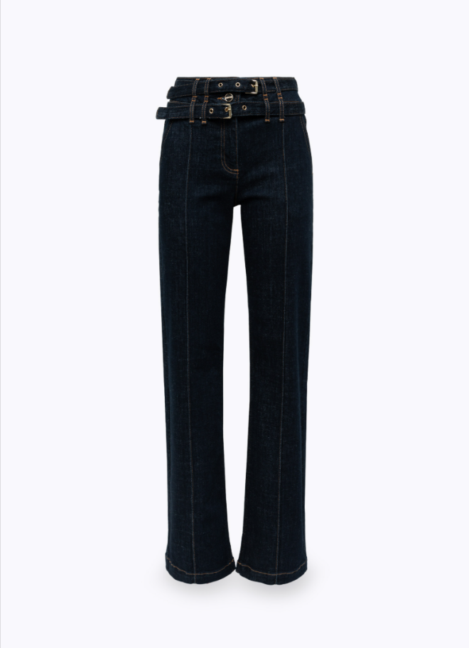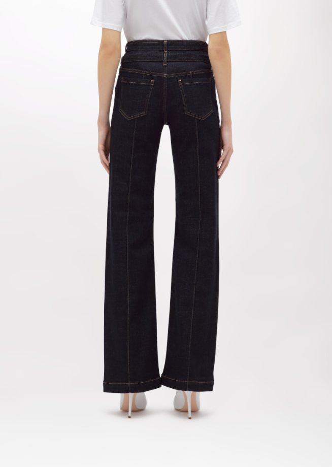 Um clássico reinventado: jeans em algodão elástico com acabamento blue rinse wash, da linha regular, que alia conforto e sofisticação. O destaque vai para a cintura subida com duplo cinto e passadeiras, detalhe marcante que traduz a influência da alfaiataria no denim contemporâneo.