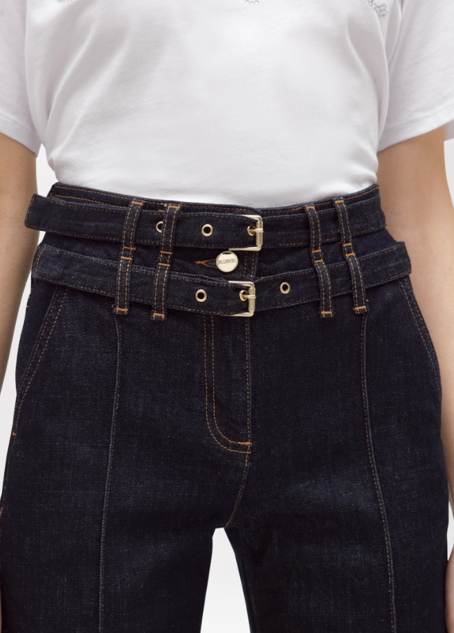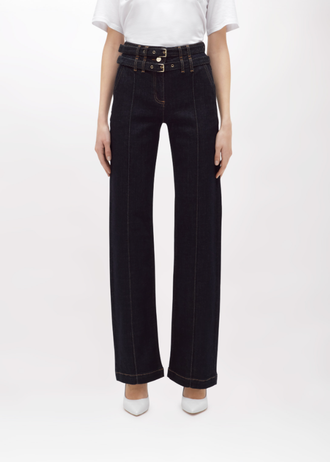 A classic reimagined: stretch cotton jeans in a blue rinse wash, from the regular line, combining comfort with sophistication. The highlight is the high waist with a double belt and loops, a striking detail that channels tailoring influences into contemporary denim.