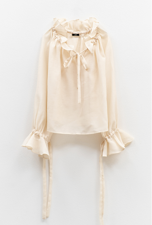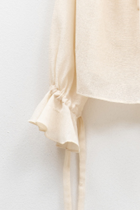 Designed with flared sleeves, adjustable cuff ties and soft ruffles for a refined, romantic effect.