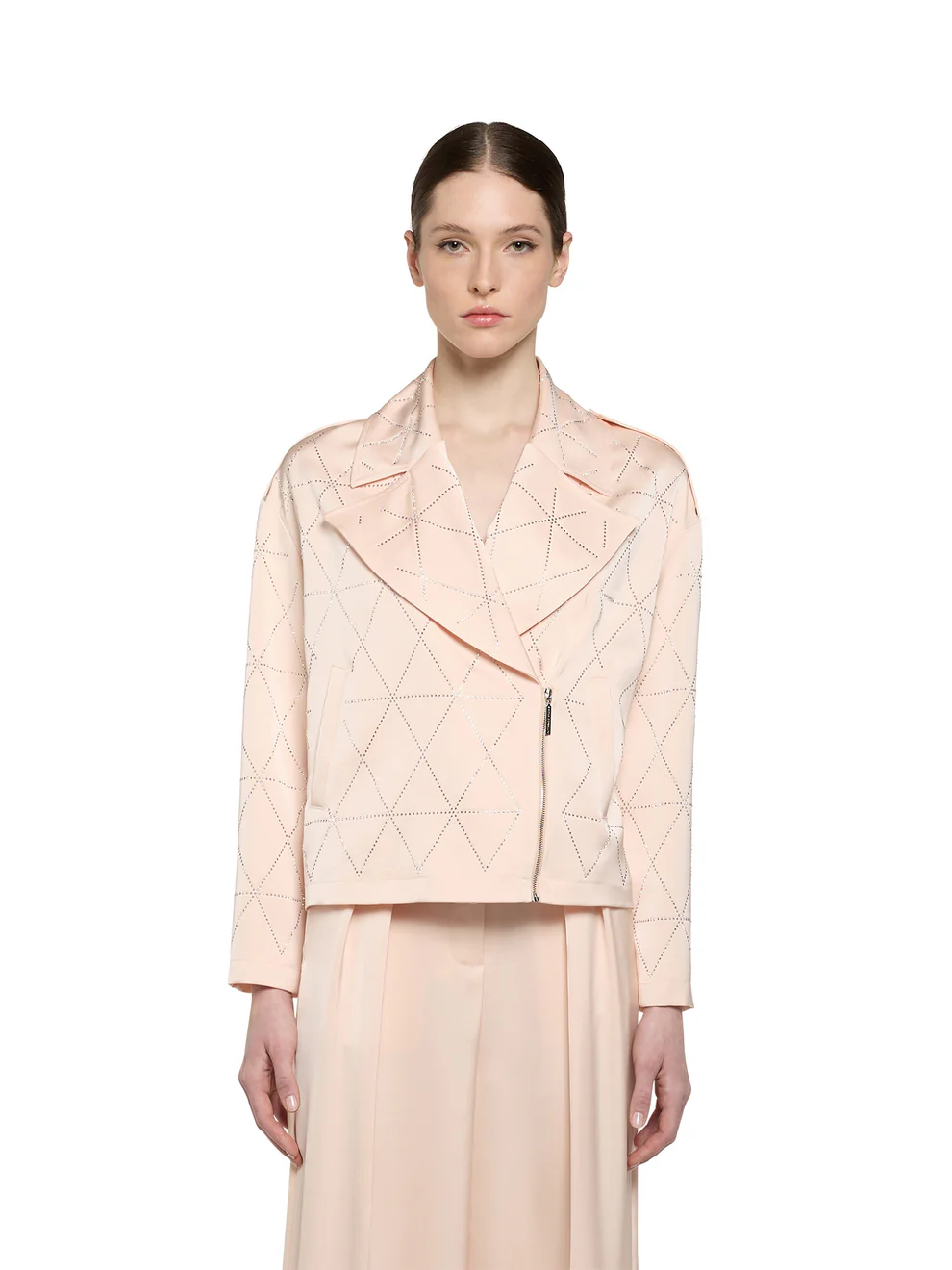 Its reimagined biker cut gains elegance through an all-over geometric pattern of crystal studs, creating a refined interplay of light and structure. Featuring a wide lapel collar and asymmetric metal zip fastening, this piece blends timeless tailoring with contemporary shine – perfect to elevate minimalist or tonal looks.