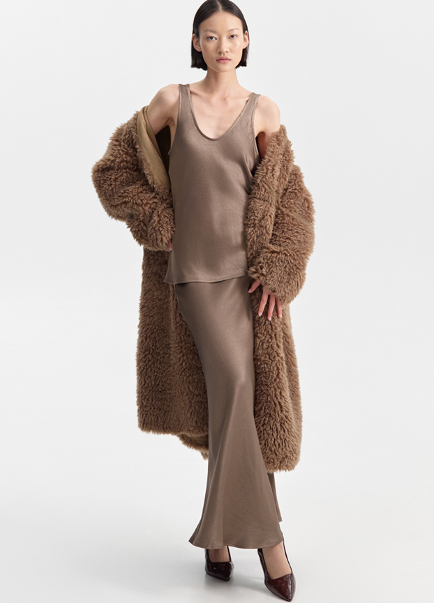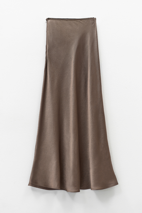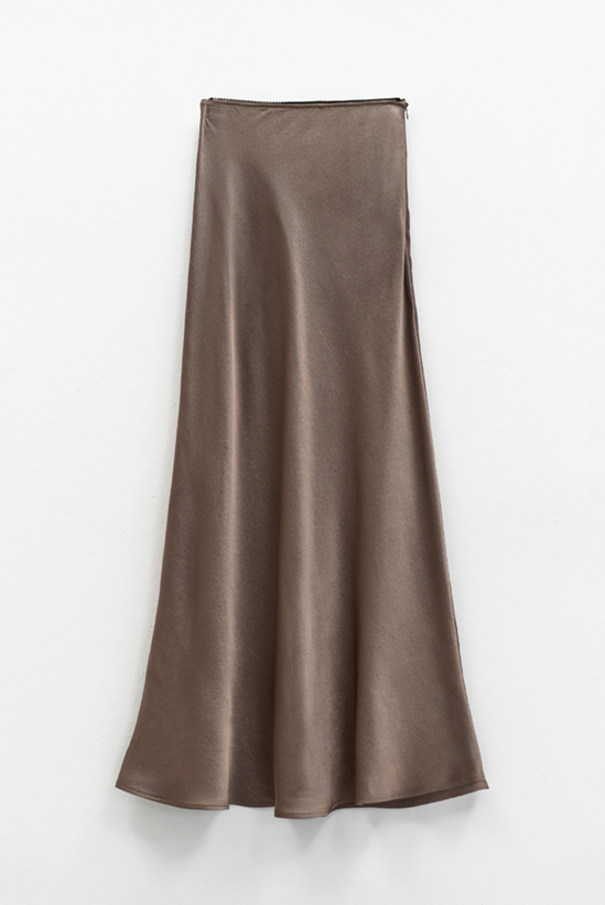 Midi satin skirt with a fluid cut and elegant bias fit that softly follows the body’s lines. Crafted in glossy taupe grey fabric, it offers a refined silhouette ideal for day-to-night styling. Invisible side zip fastening. Perfect with silk shirts, fine knits, or oversized blazers. Composition: 100% Polyester Colour: Taupe Grey