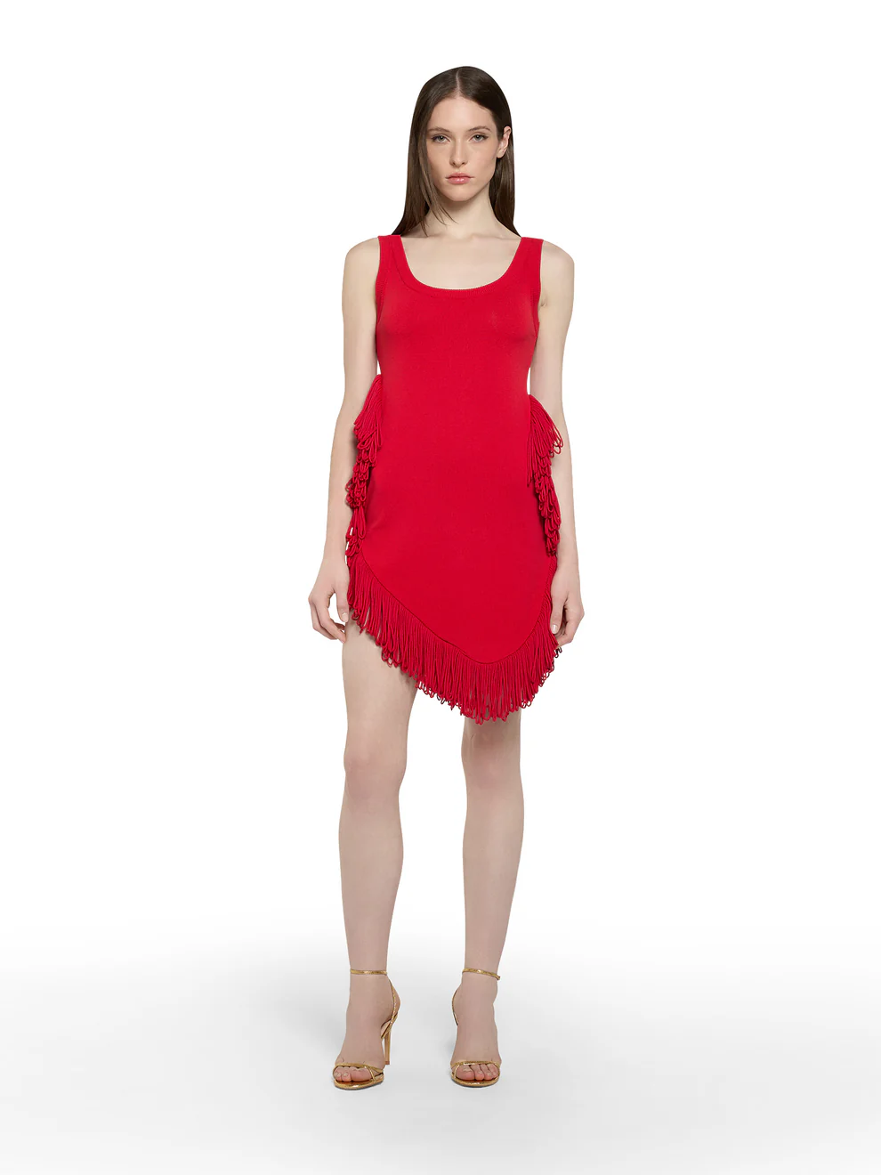 Featuring side cut-outs and soft, voluminous fringe along the sides and asymmetrical hem, it enhances every step with fluid energy. The Berry Kiss hue, a deep and vibrant red, adds confidence and allure — perfect for standout moments day or night.