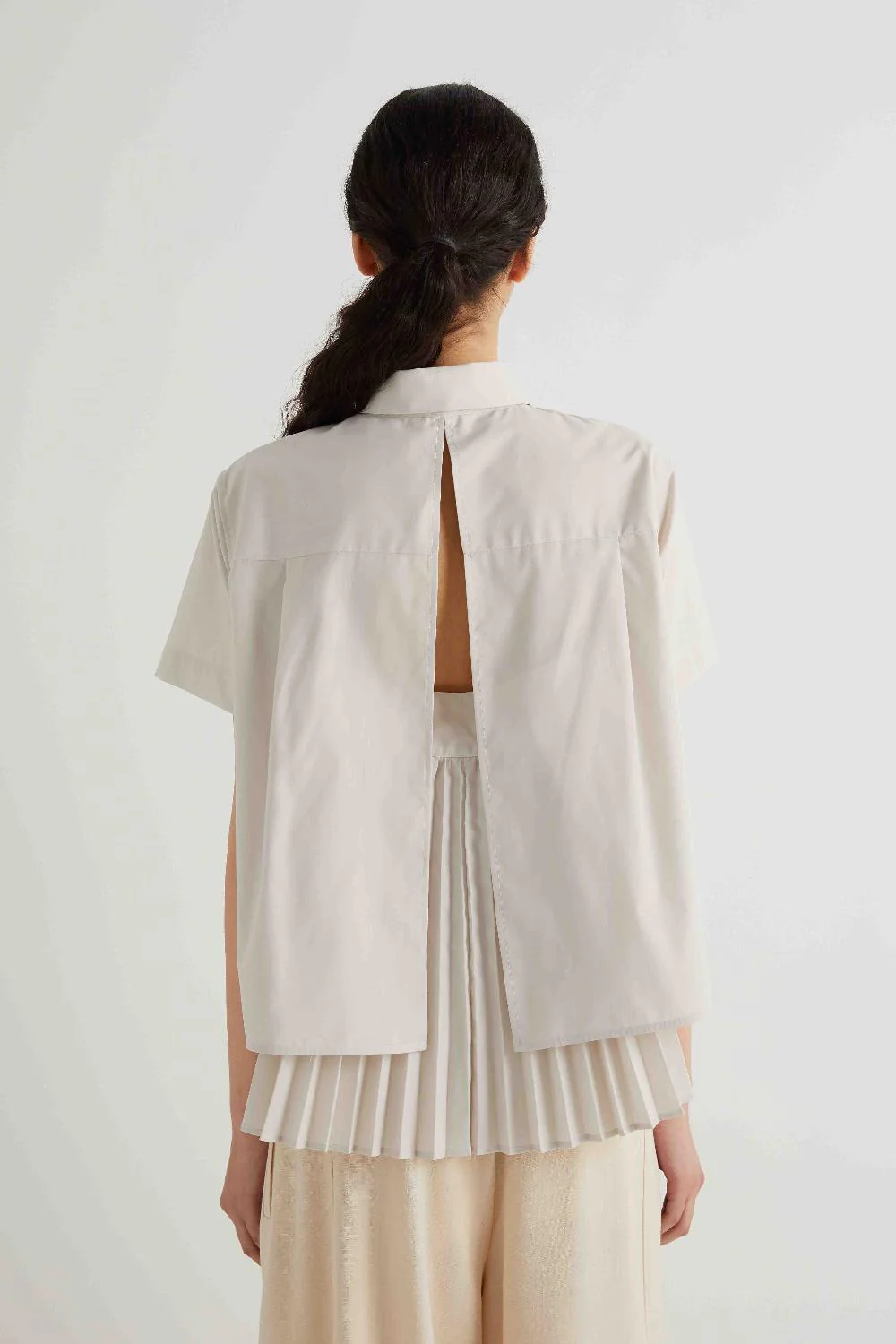 A clean front and a sculptural pleated back — a modern short‑sleeve shirt with elegant movement and subtle architectural flair.
