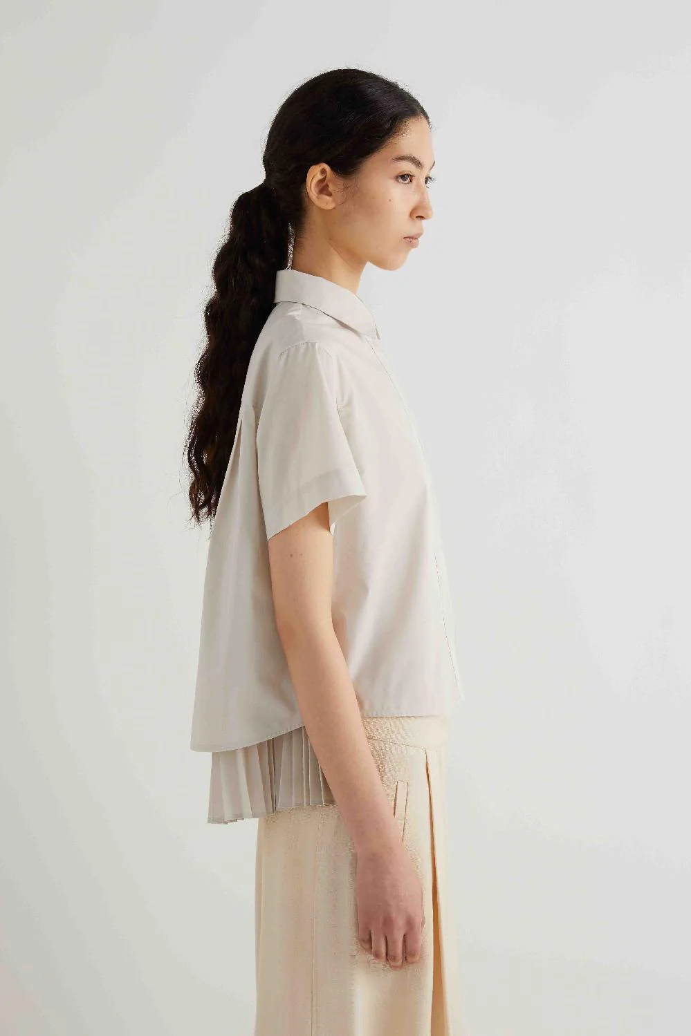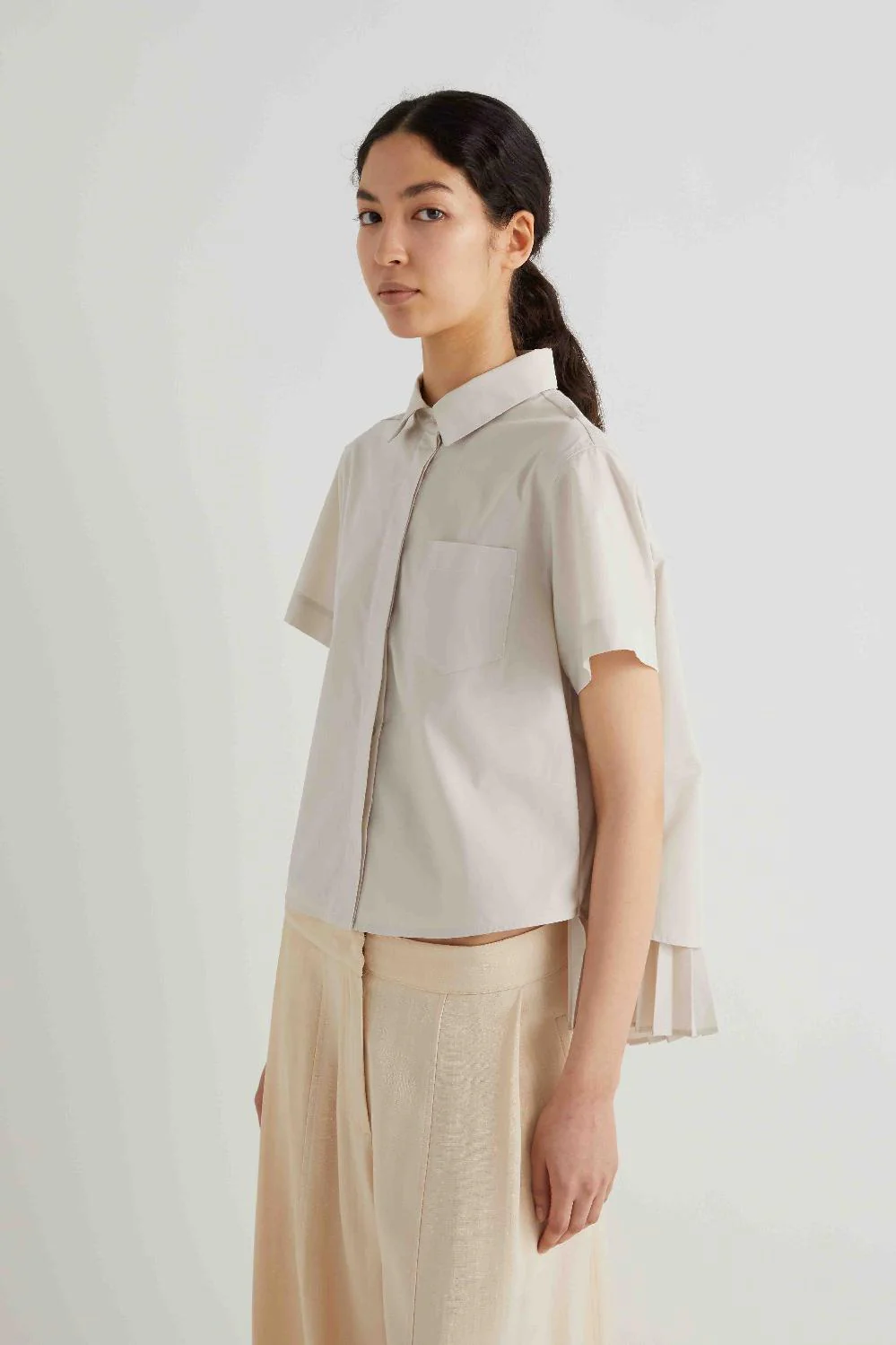 Elegant and unexpected, this short‑sleeve shirt in a polyester‑cotton blend features a clean, minimalist front and a sculptural pleated panel at the back that transforms the silhouette.