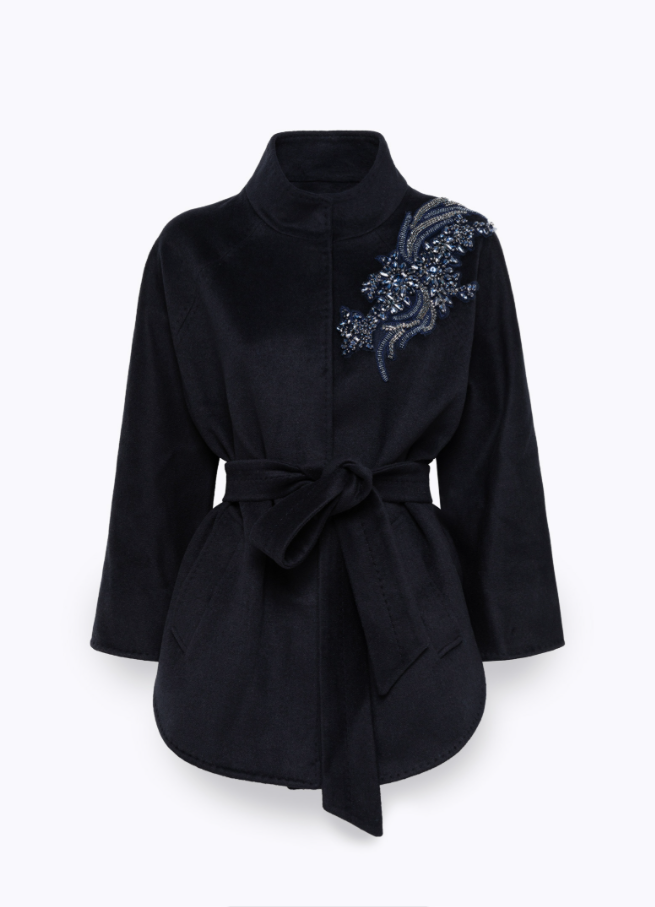 Embellished short wool coat — nocturnal glow and refined craftsmanship.