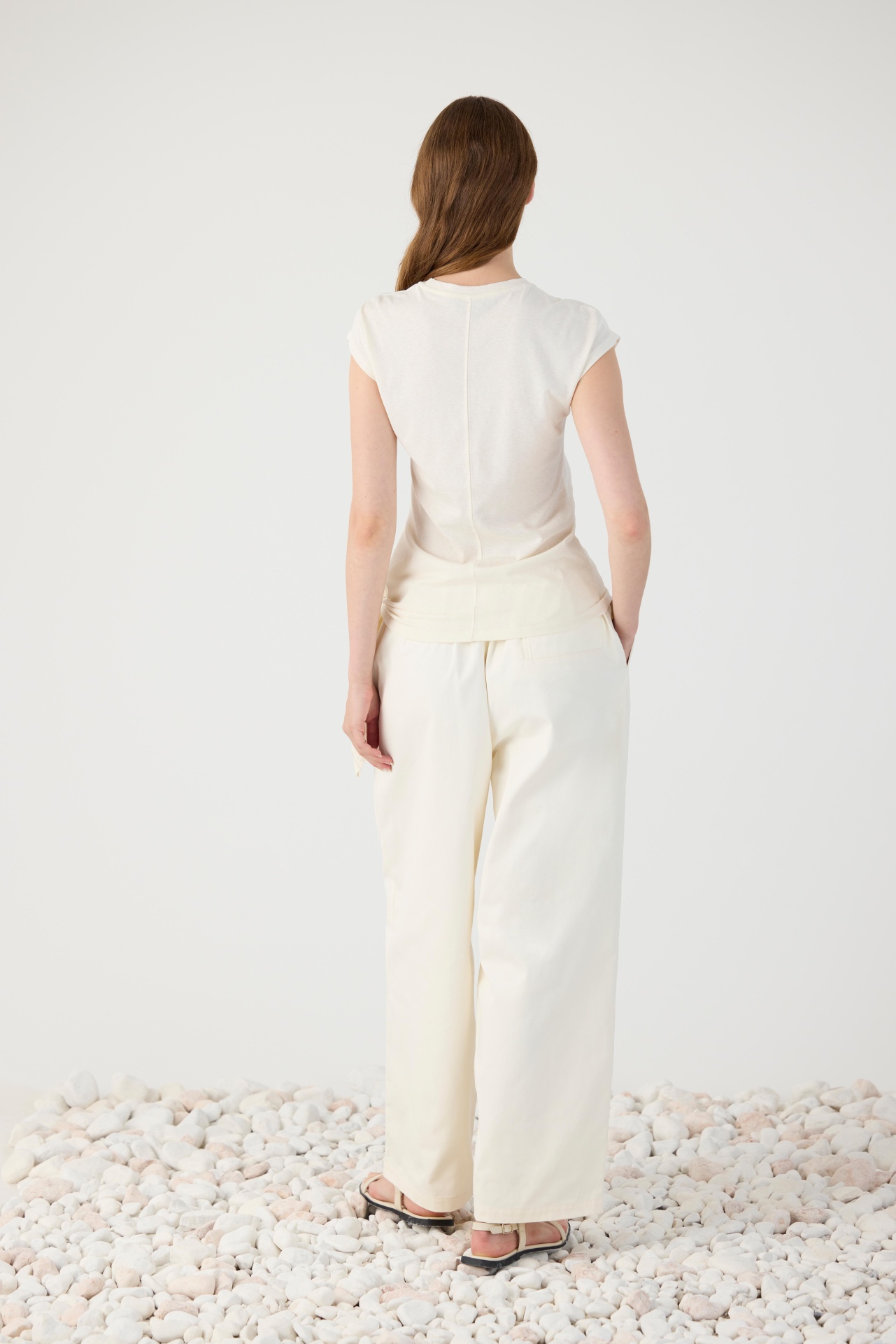 Calças largas de linho ou ganga, sandálias de tiras finas e acessórios discretos para um look leve e sofisticado.