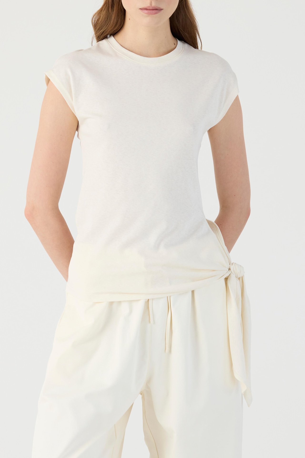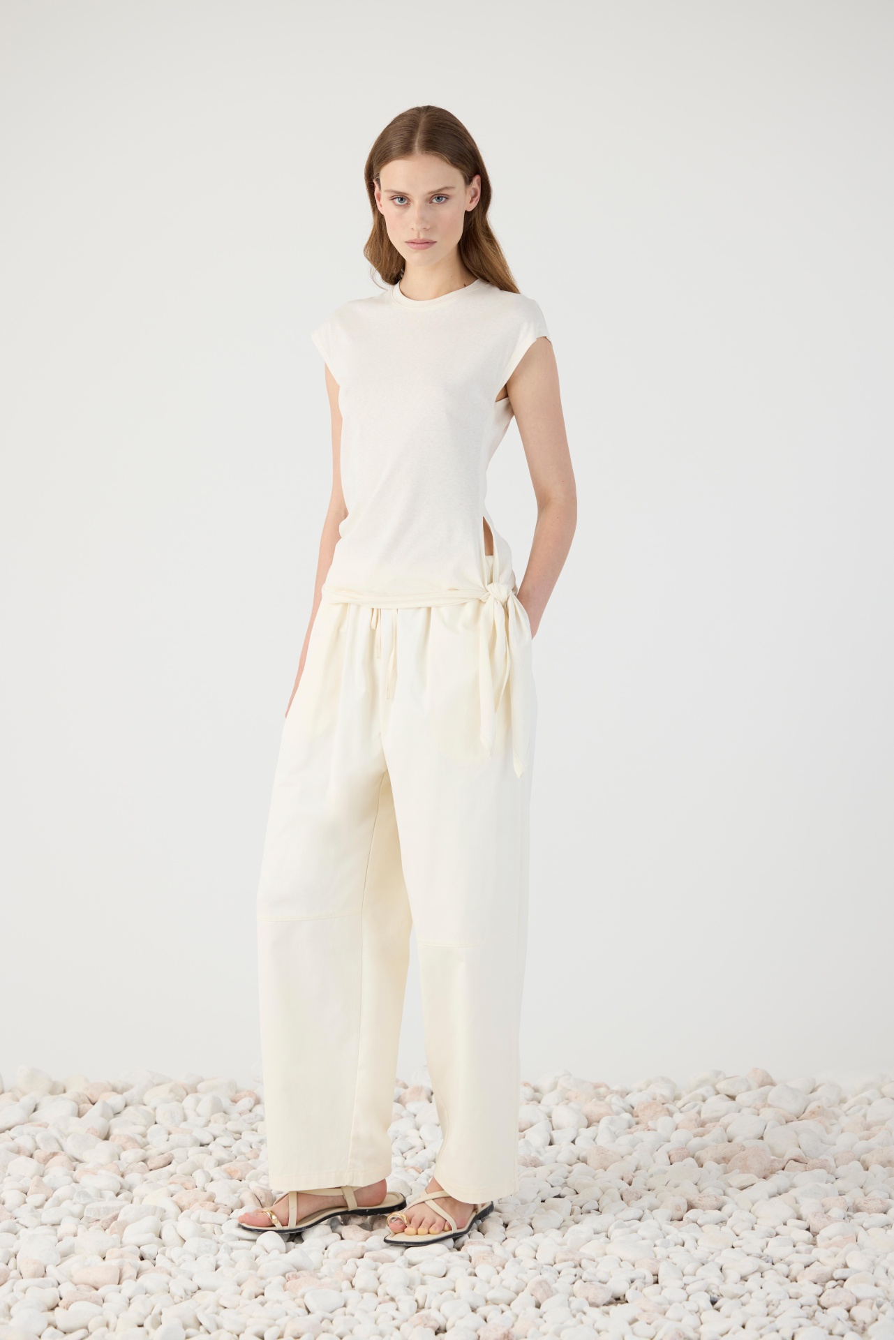 A refined sleeveless T-shirt crafted from a soft cotton blend with a touch of linen for natural breathability. The clean silhouette is elevated by subtle side cut-outs and an adjustable tie detail at the waist, creating a relaxed yet feminine shape. Lightweight and comfortable, it drapes effortlessly on the body, making it an easy piece for warm-weather styling while maintaining a polished, contemporary feel.