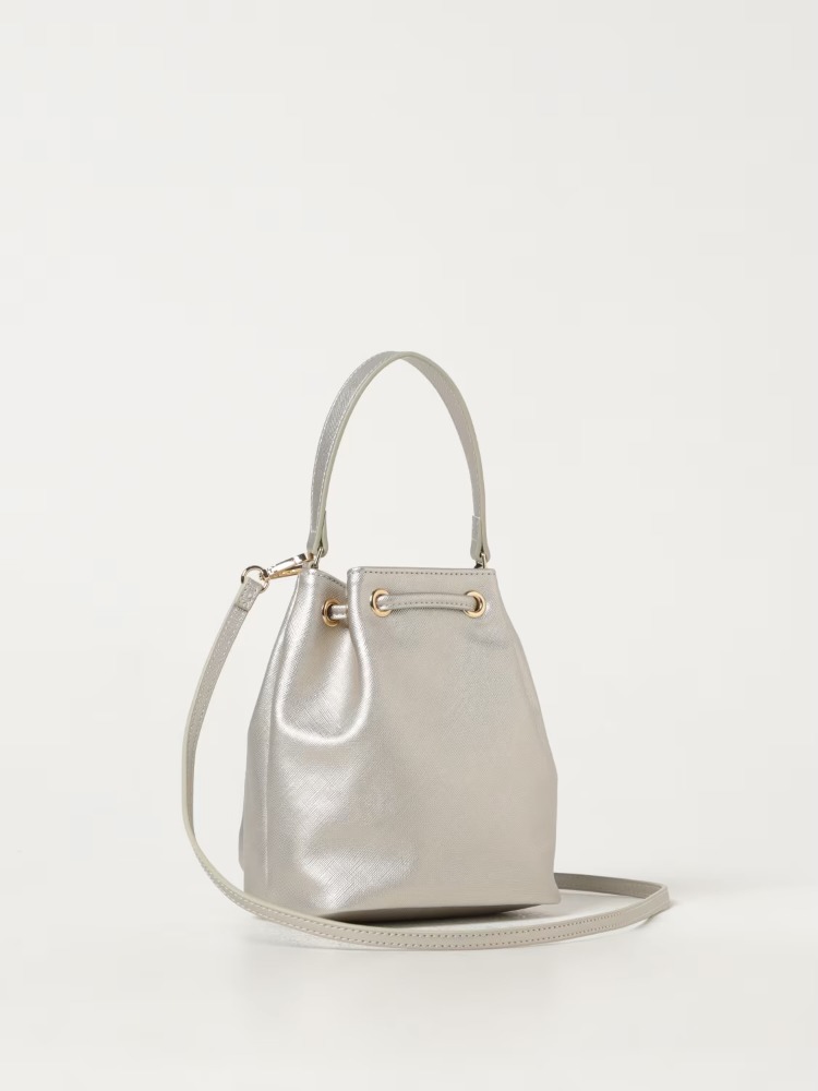 This Twinset Milano mini bucket bag is where shine meets sophistication. Crafted in metallic faux leather, it features a silver finish with gold-tone details, a drawstring closure, a front zipped pocket, and the brand’s signature metal “T” logo. Compact yet functional, it adds a luminous touch to any outfit — from casual daywear to chic evening looks.