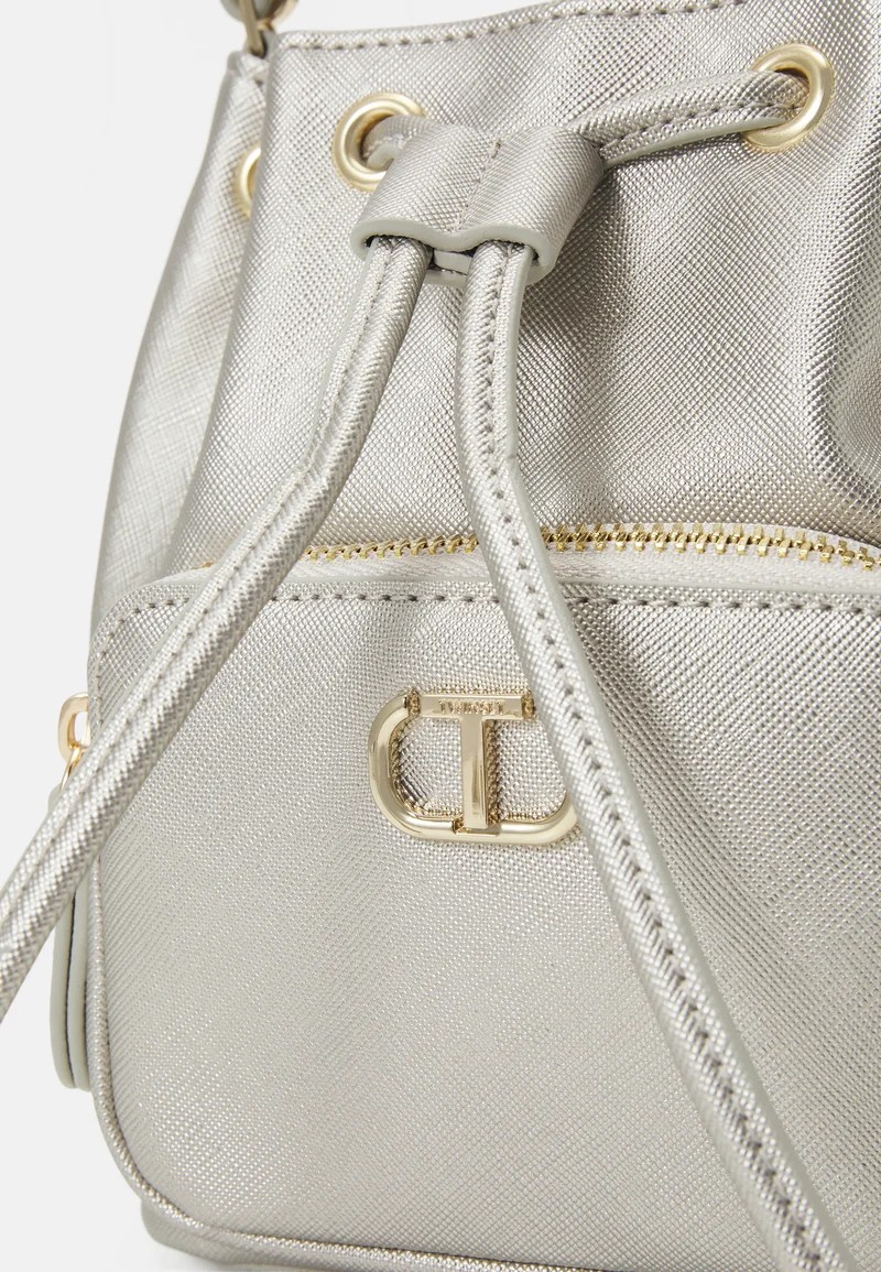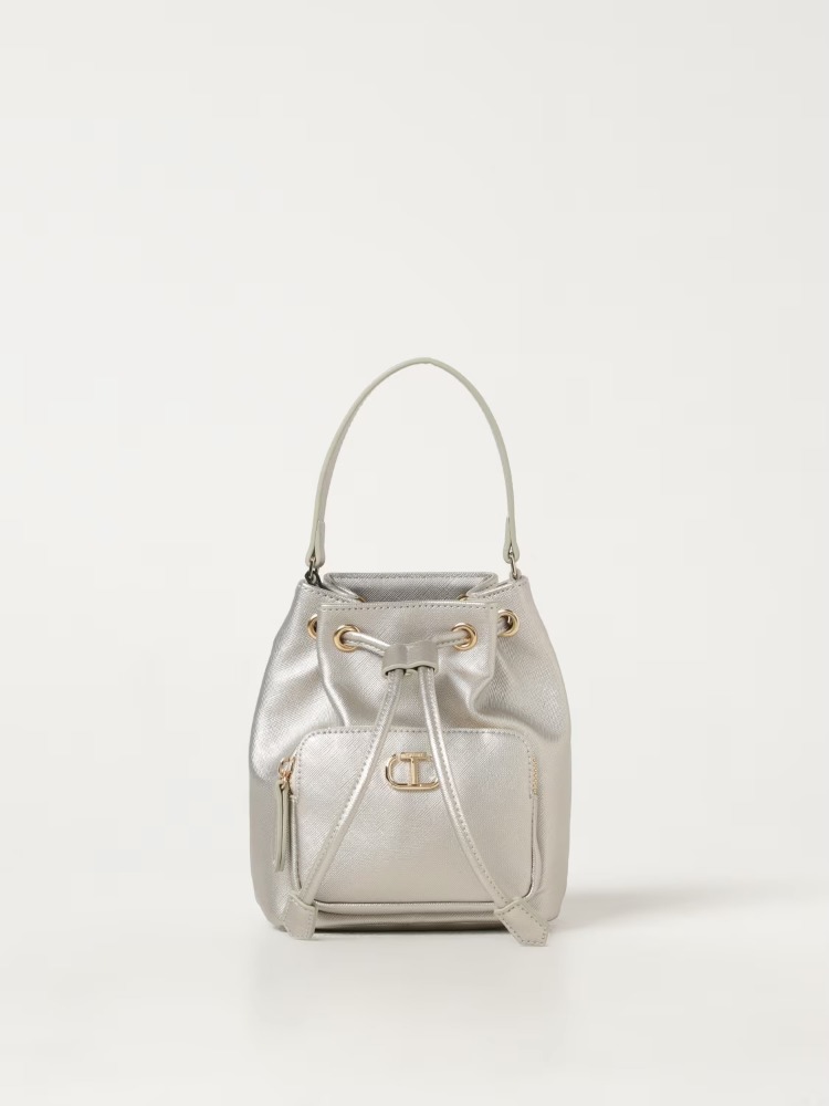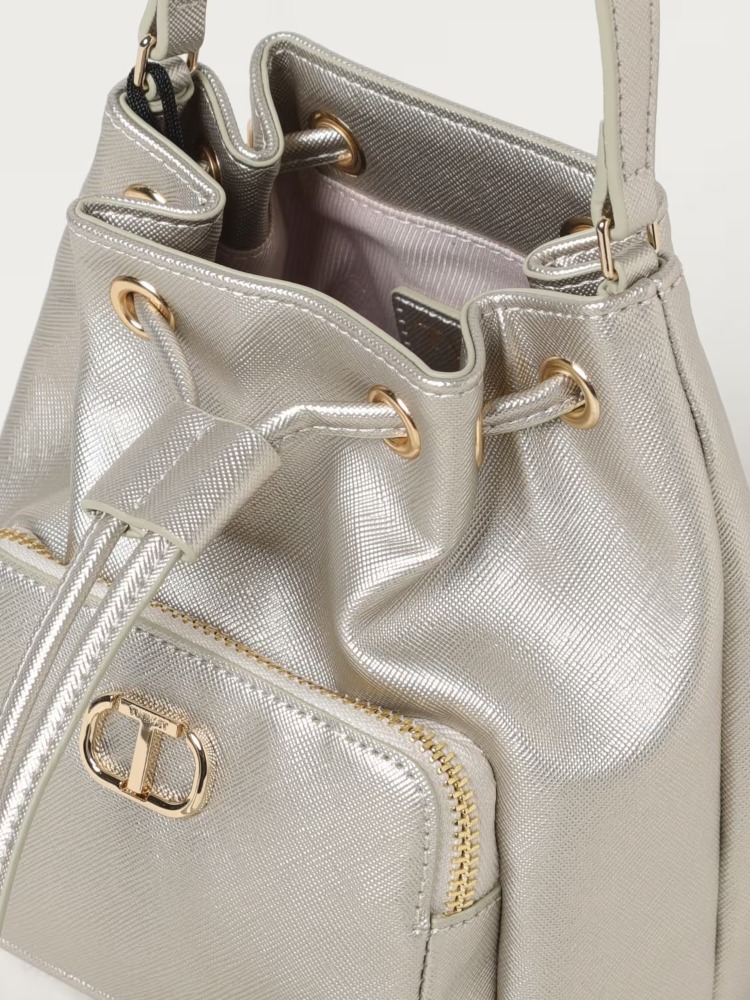Este mini saco tipo bucket da Twinset Milano é a fusão perfeita entre brilho e funcionalidade. Fabricado em pele sintética metalizada, apresenta um elegante acabamento prateado com detalhes dourados, fecho em cordão ajustável, bolso frontal com fecho de correr e o logótipo metálico “T” da marca.