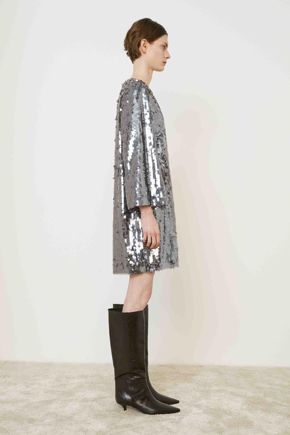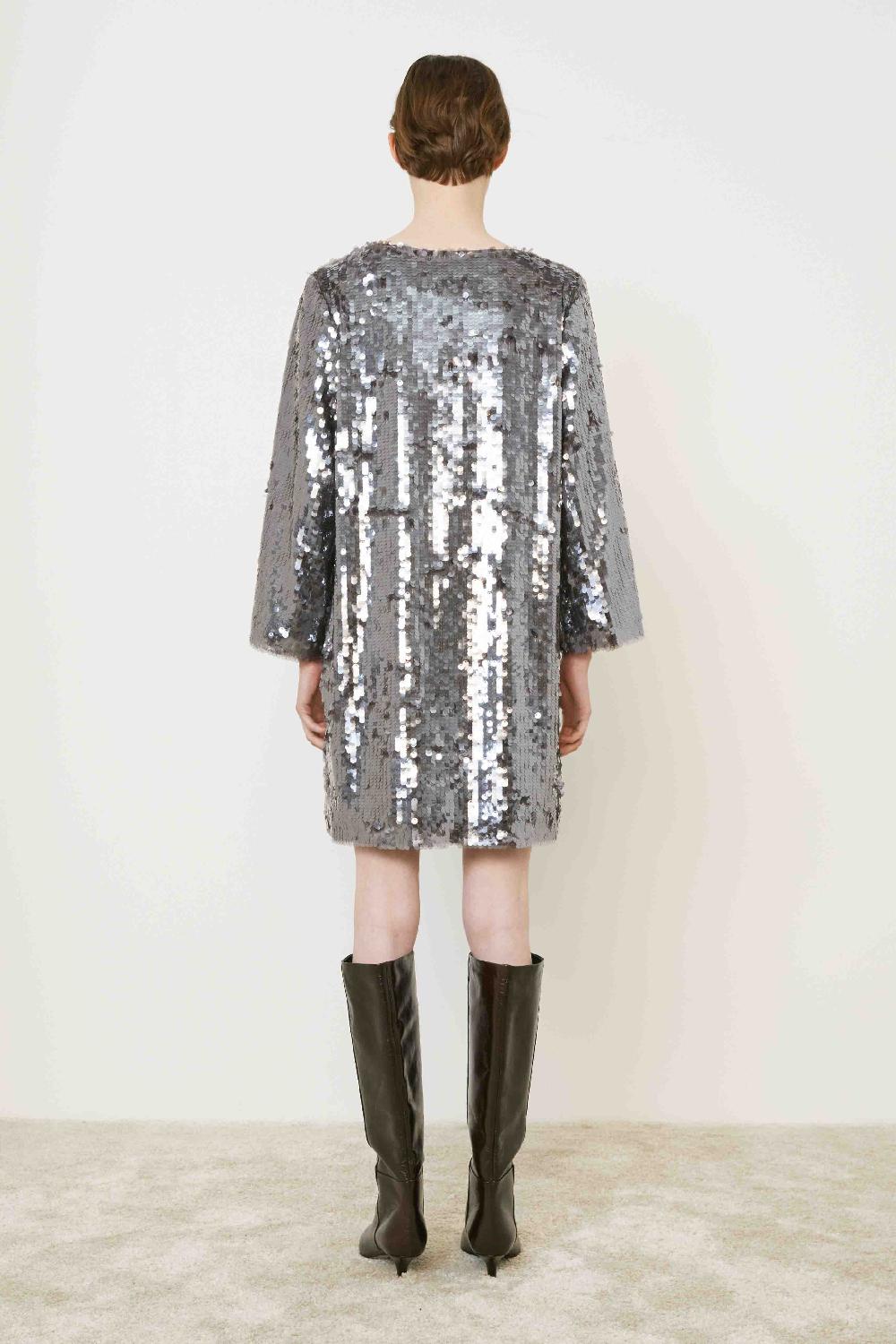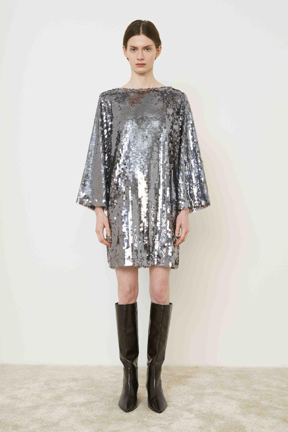 A short dress fully embroidered with silver sequins, featuring a straight silhouette and wide sleeves that create soft, fluid movement. Its mirrored surface catches the light beautifully, delivering instant presence with refined ease. A contemporary statement piece for those who appreciate modern glamour without excess.