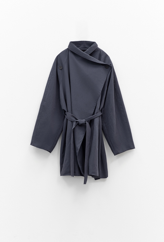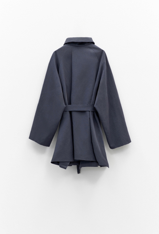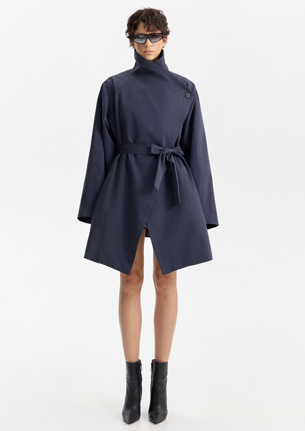 With its wrap-around silhouette and waist belt, it reinterprets the classic trench through a sculptural, minimalist lens.
