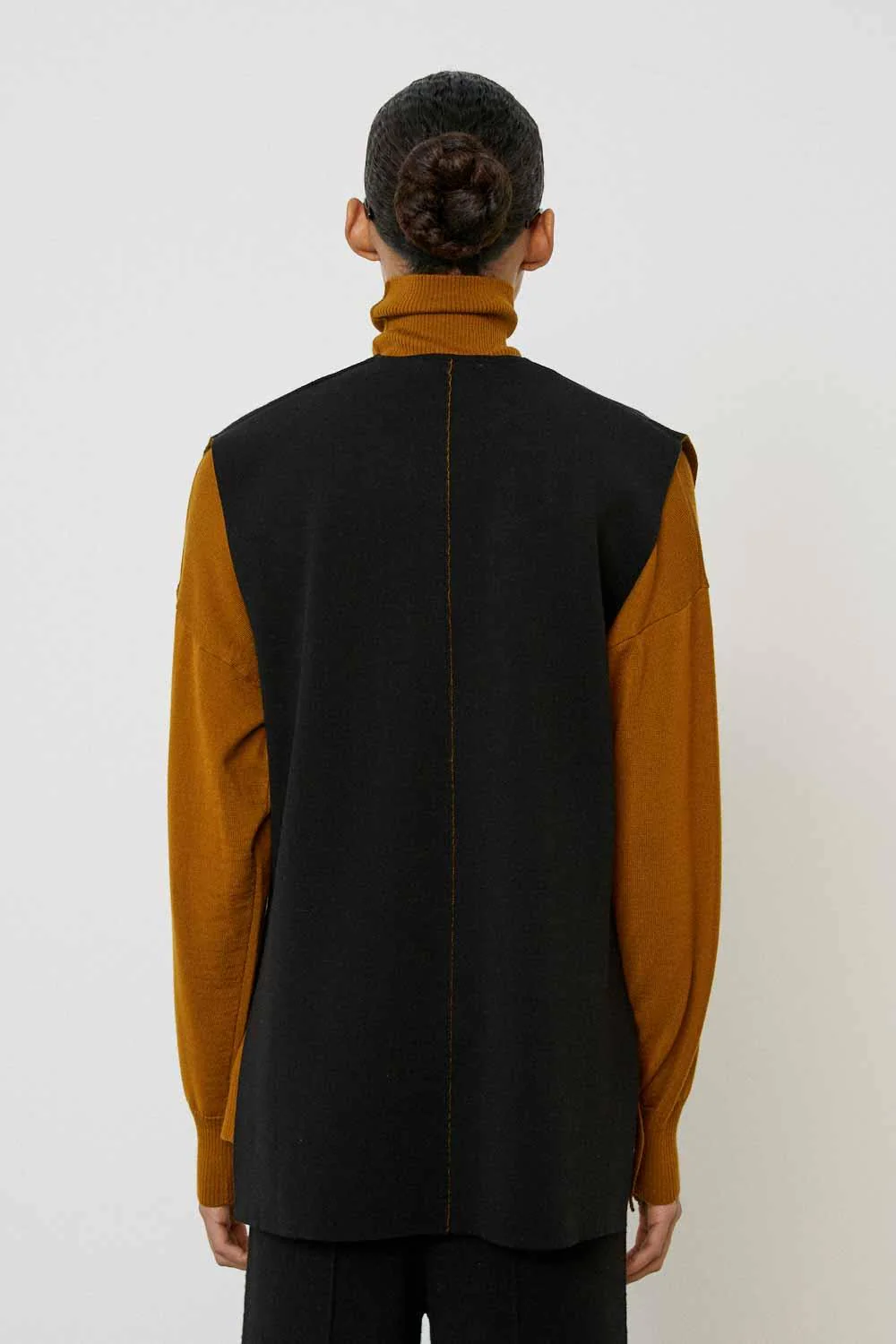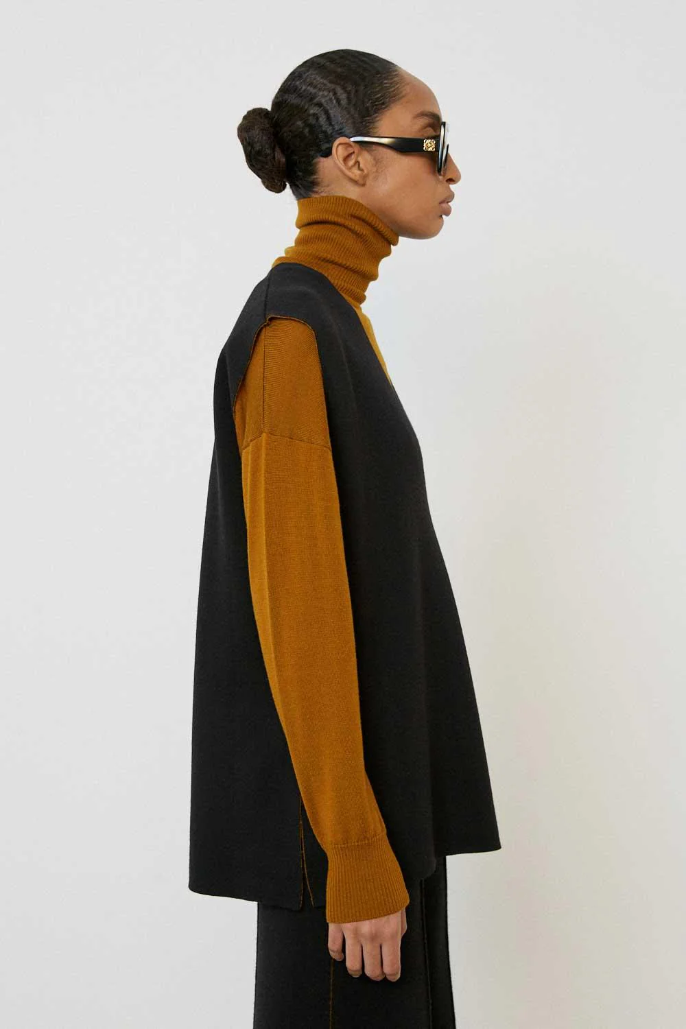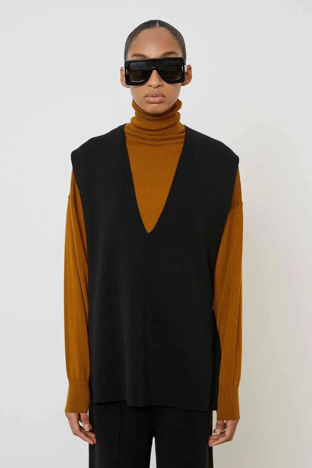 Black sleeveless knit with V-neck and side slits – minimalist layering essential