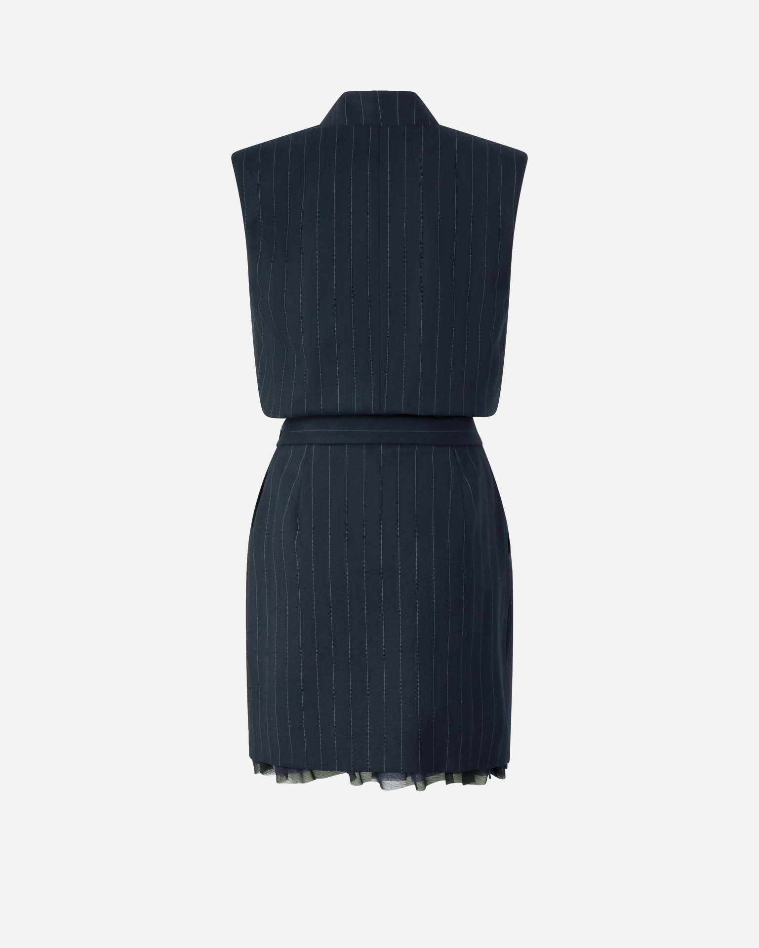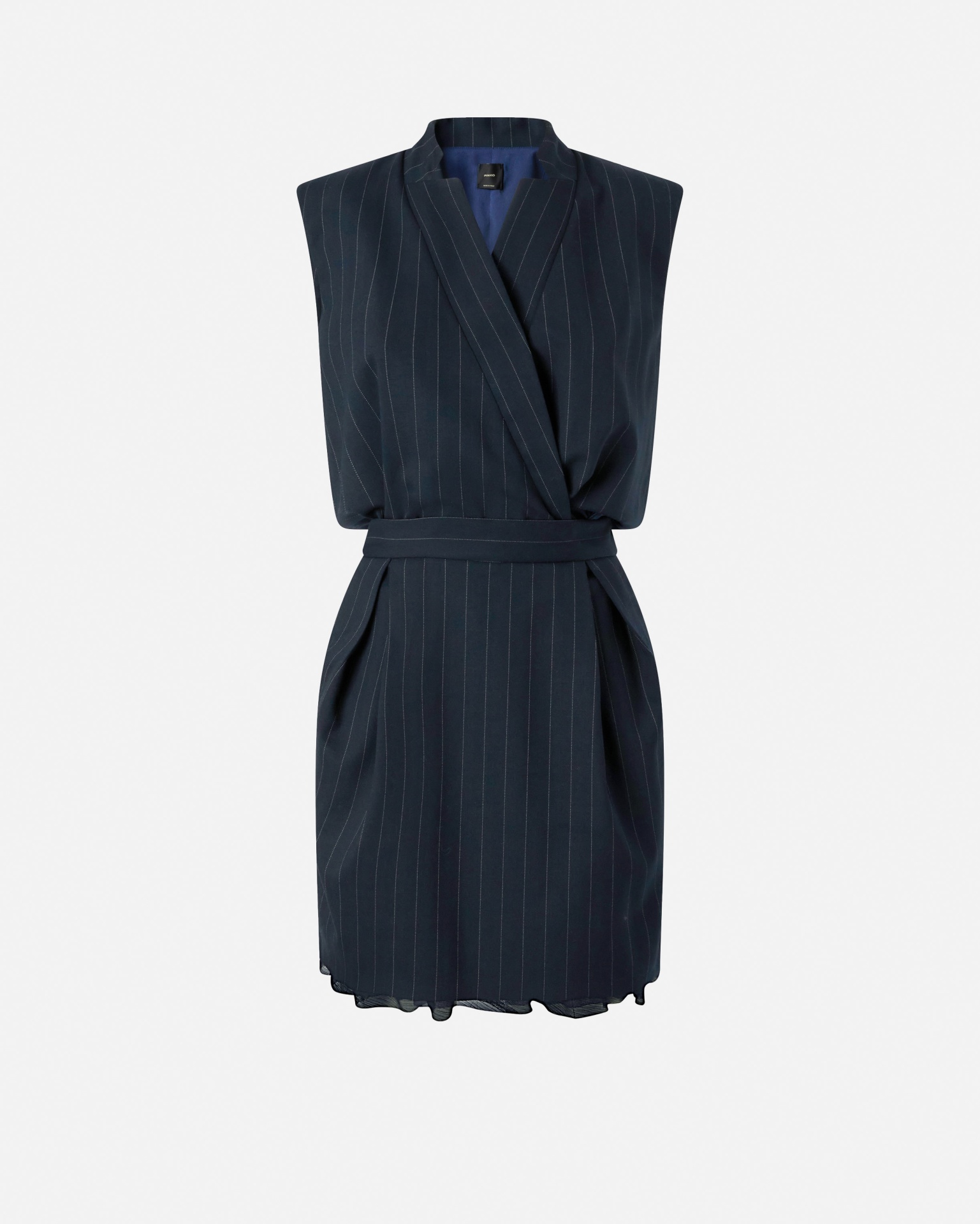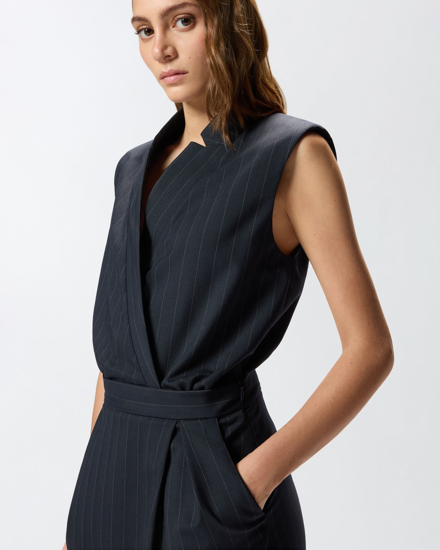 Short, sleeveless dress made from a resistant poly-wool fabric that prevents creasing and features a distinctive double herringbone weave highlighting the pinstripe pattern. The wrap design with lapel collar and waist belt enhances the silhouette, while the balloon skirt with a double raw-cut flounce adds a touch of femininity in contrast to the structure of the fabric. Fully lined for comfort and a perfect fit.