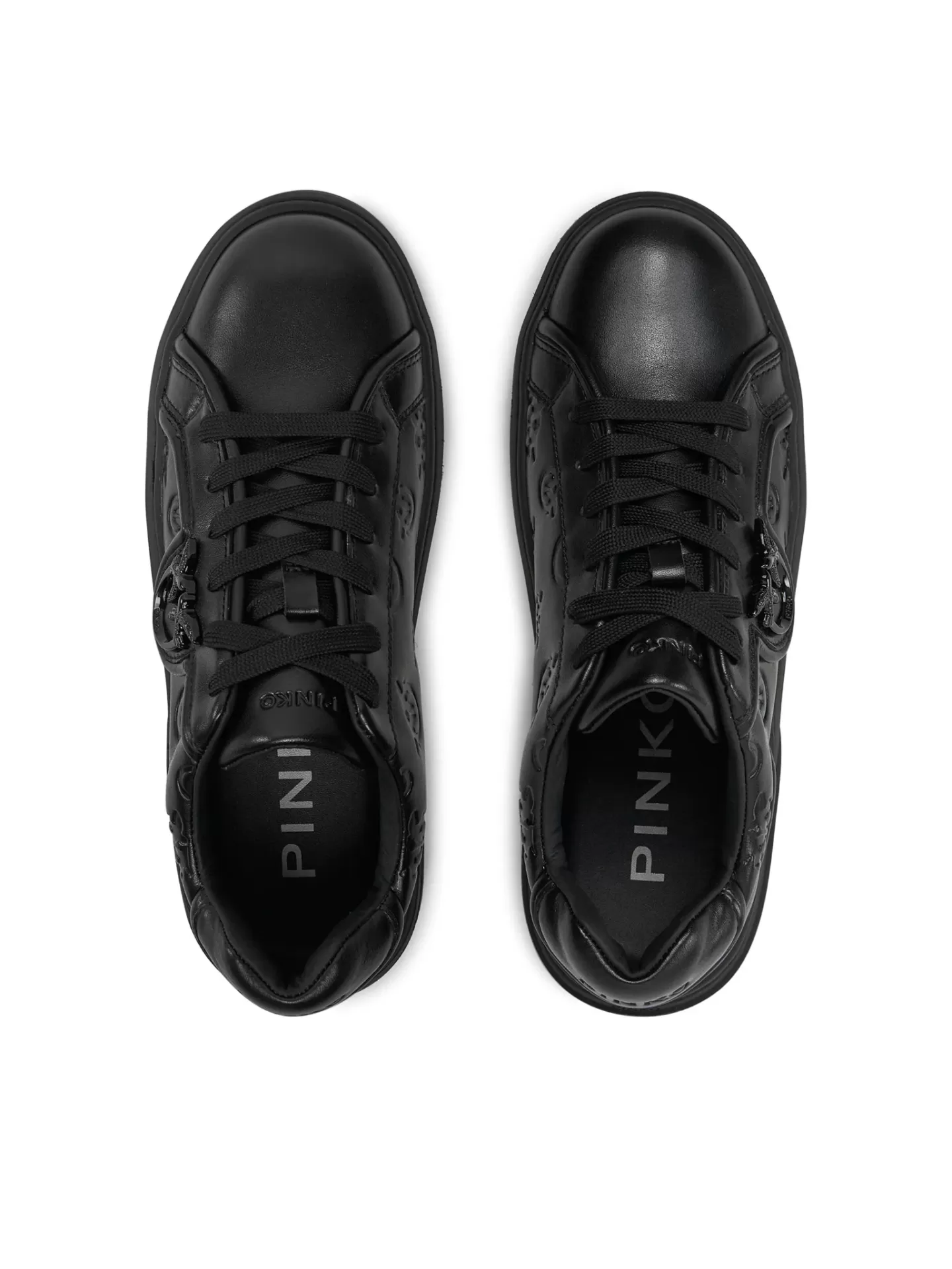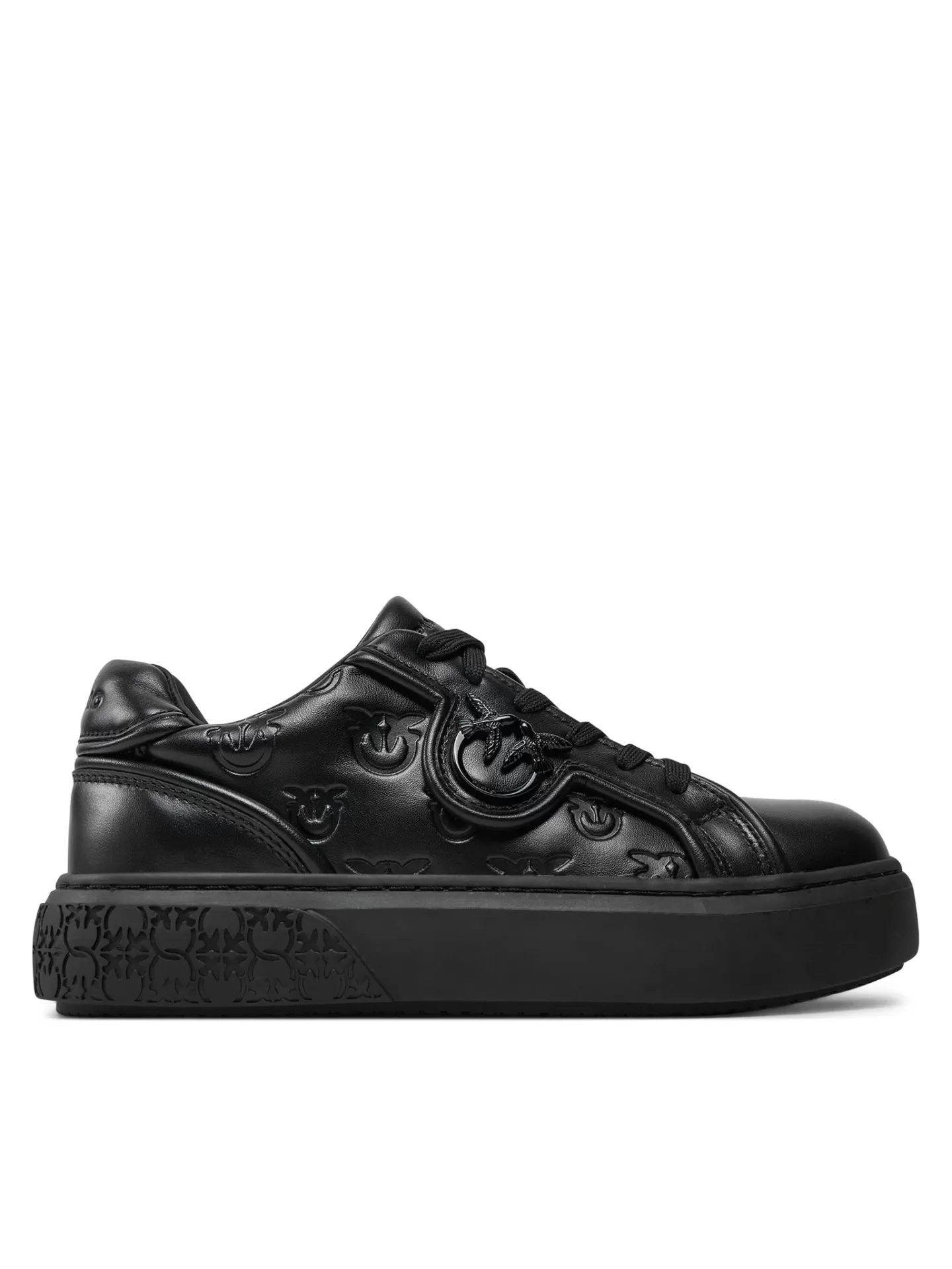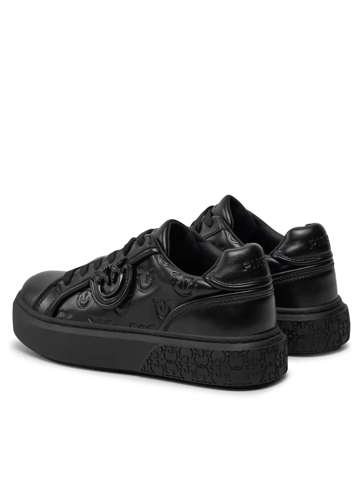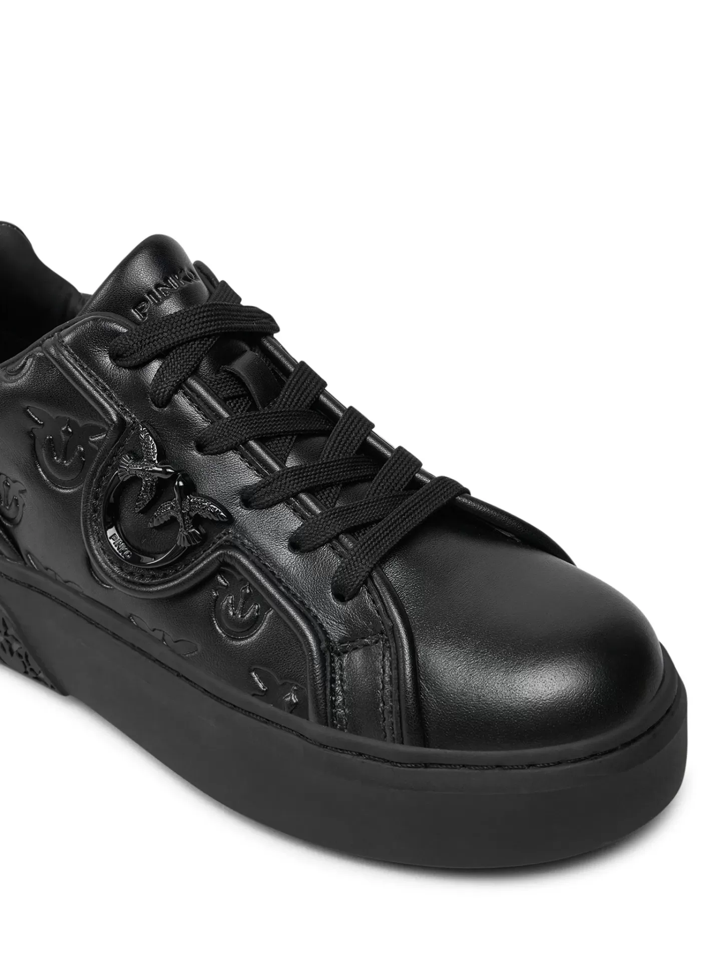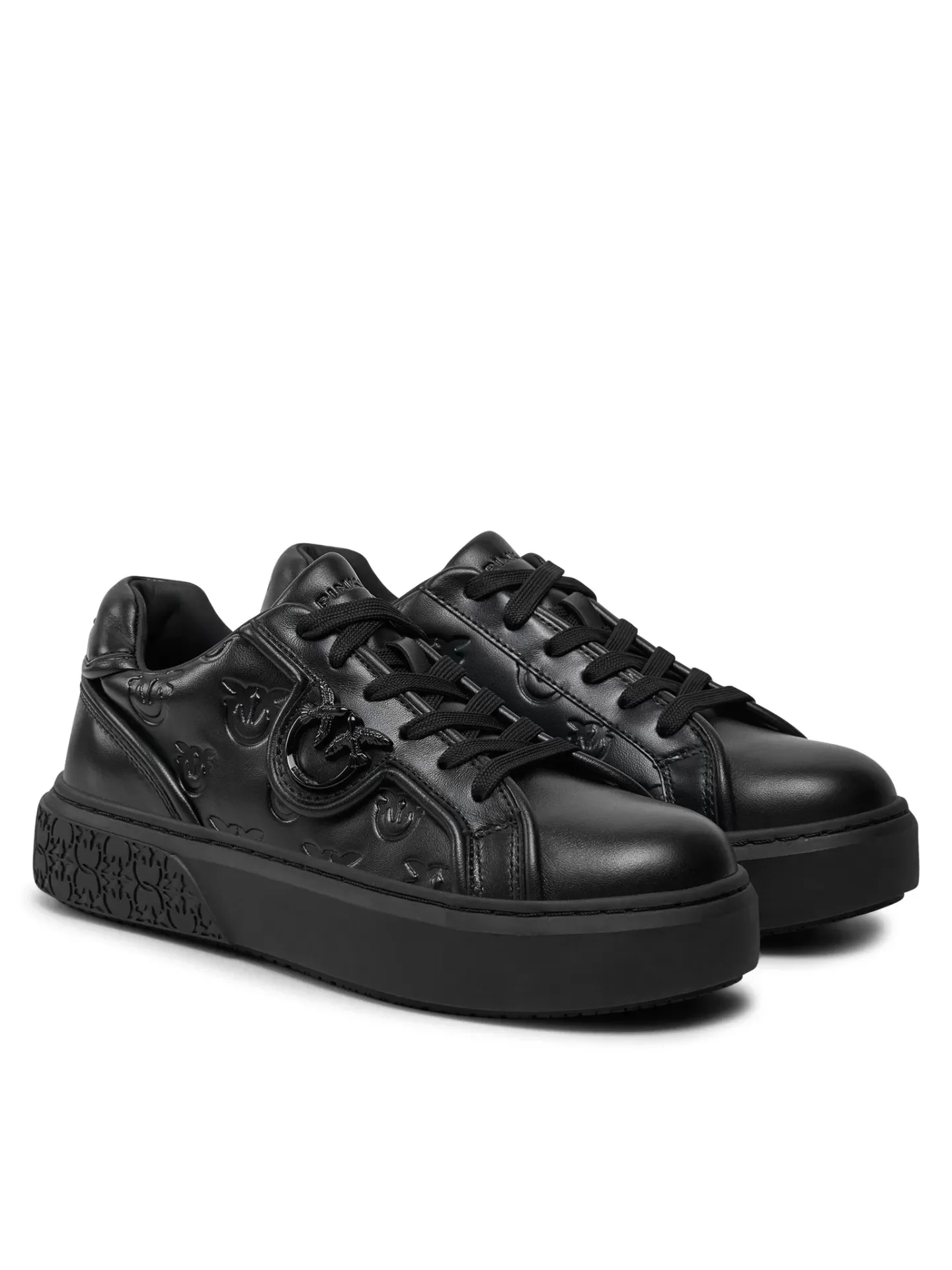 Minimalist with attitude. The PINKO Yoko 06 sneakers redefine urban style in an all-black design, featuring the embossed Love Birds monogram and premium genuine leather construction.
