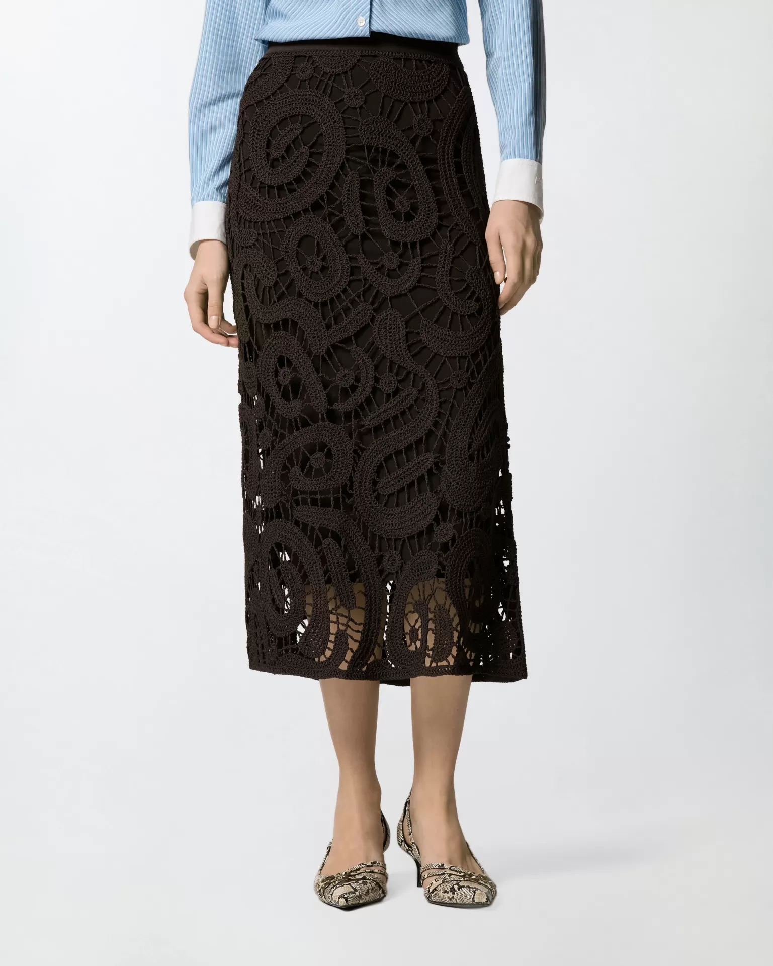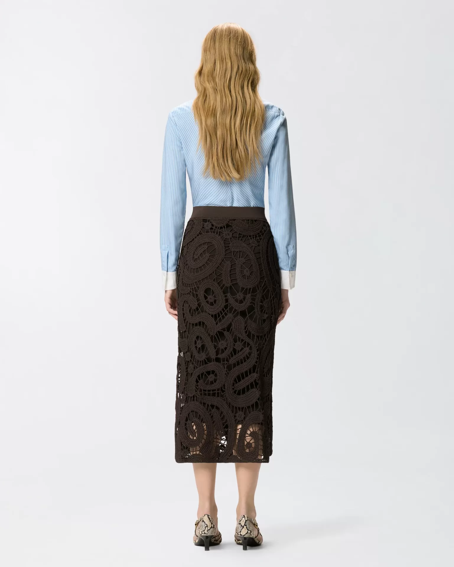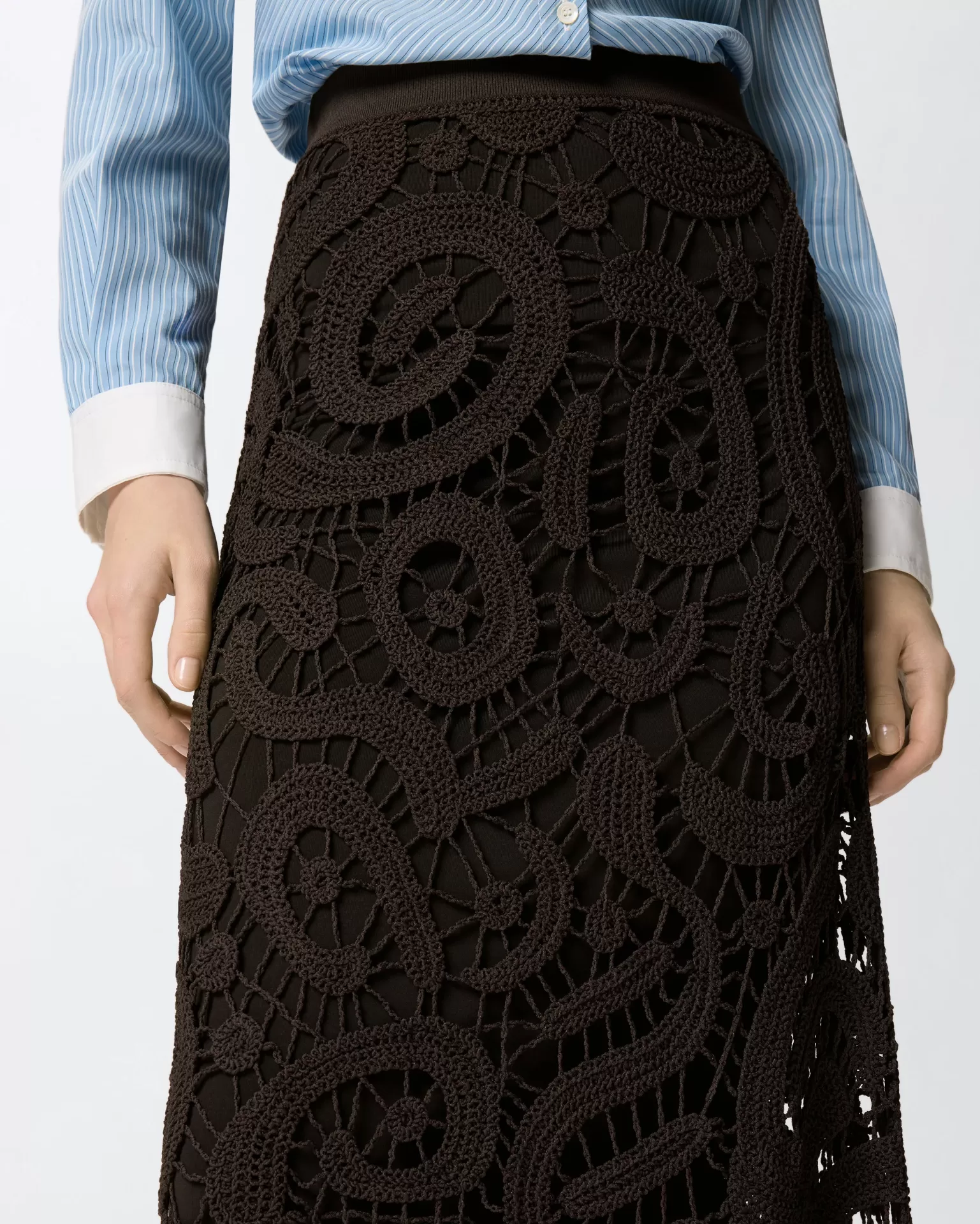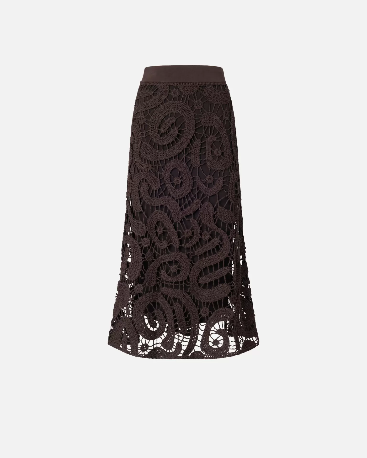 An elasticated waistband contrasts with the richness of the crochet, making the piece unexpectedly effortless to wear.