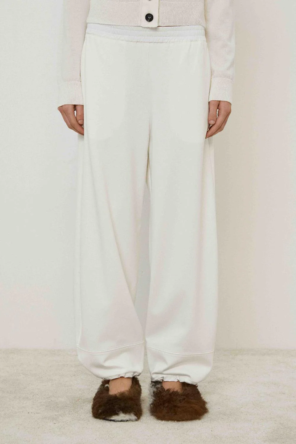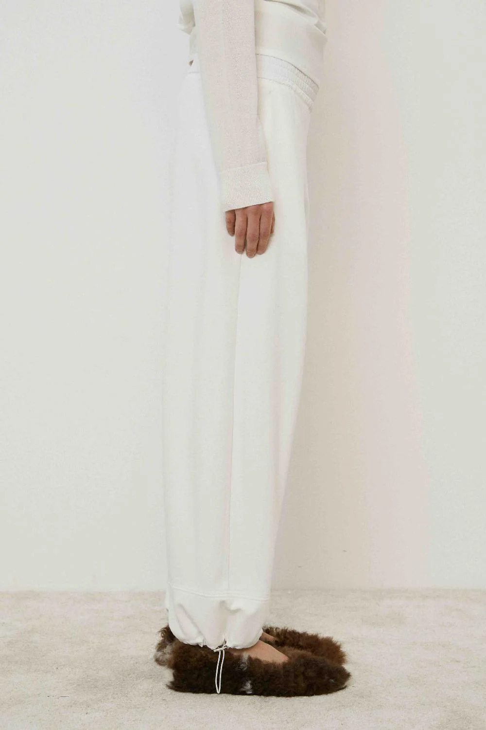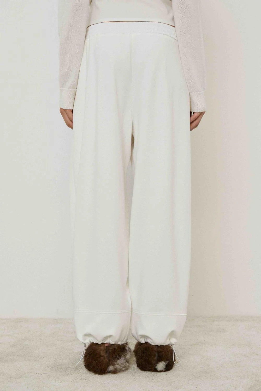 These straight-leg trousers feature refined taffeta inserts, an elasticated waistband, side pockets, and adjustable drawstring hems for a personalised fit.