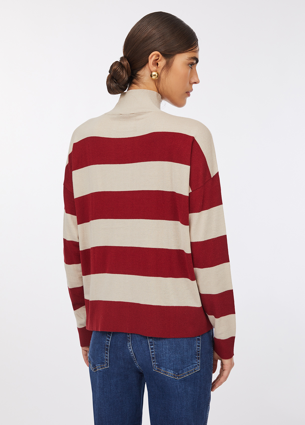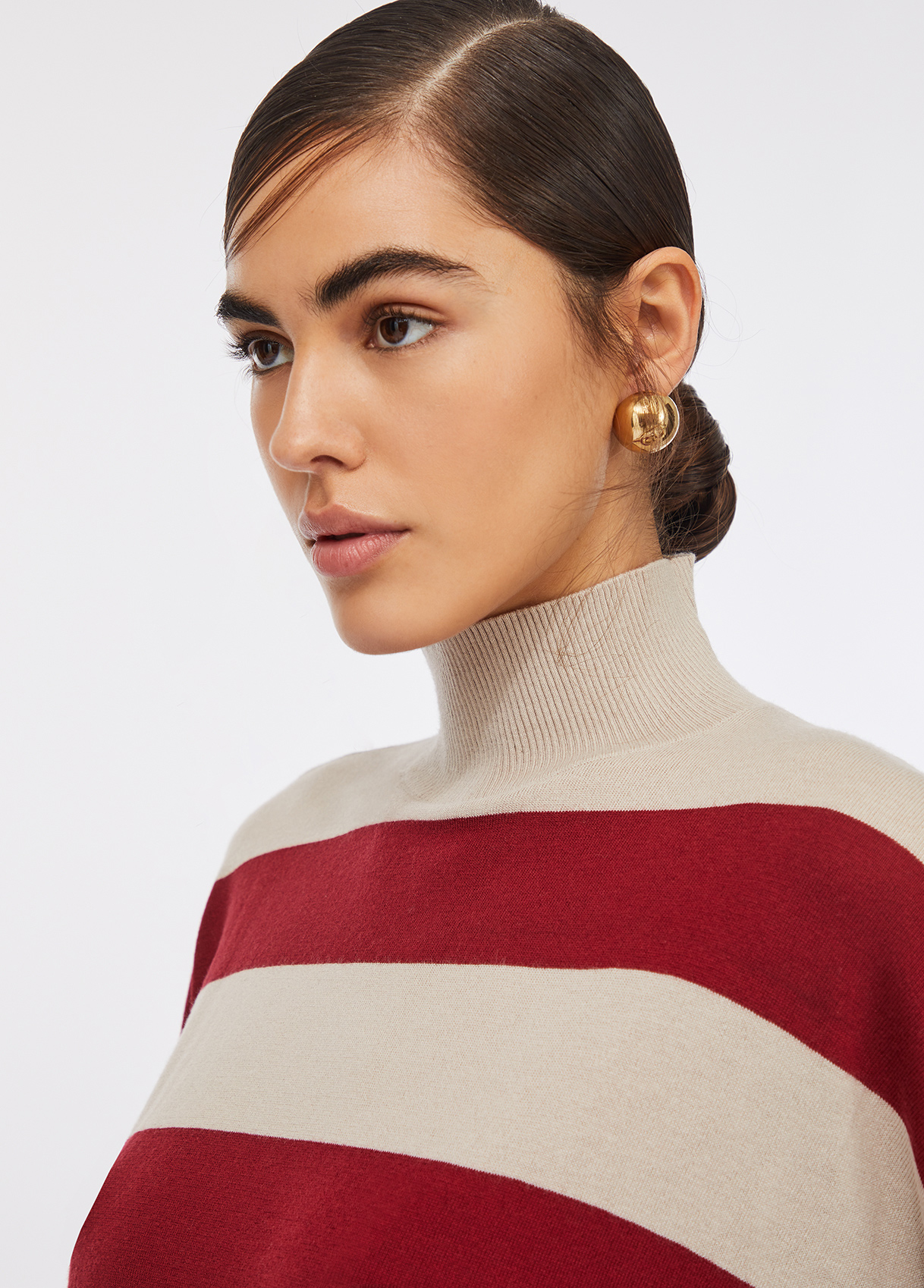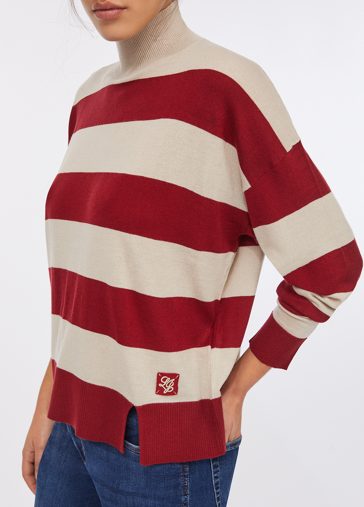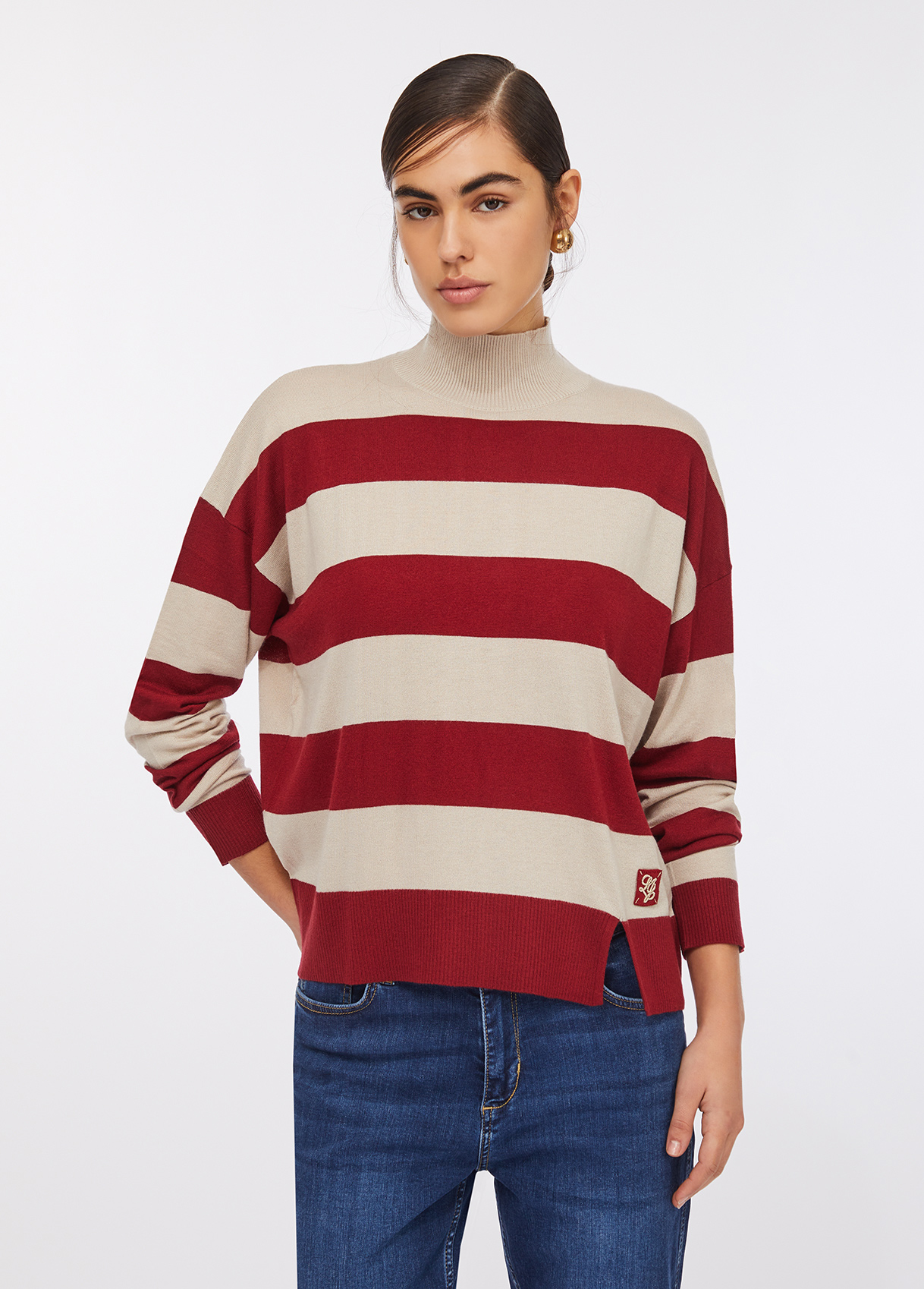 Soft wool-blend jumper with wide beige and Bordeaux red stripes. The relaxed silhouette, round neckline and subtle cut-out hem detail reflect understated sophistication. Finished with a logo patch on the hem — a discreet nod to raquelprates.com’s refined aesthetic.