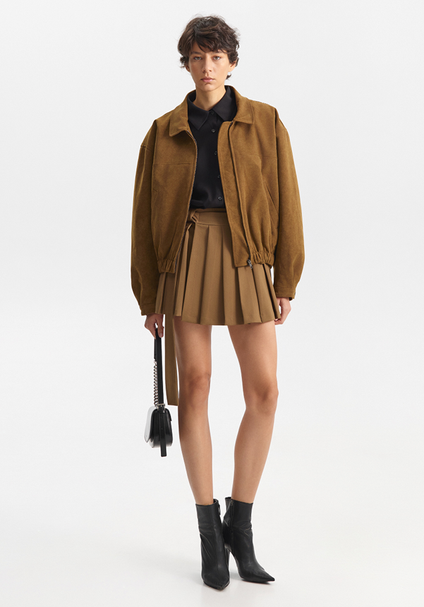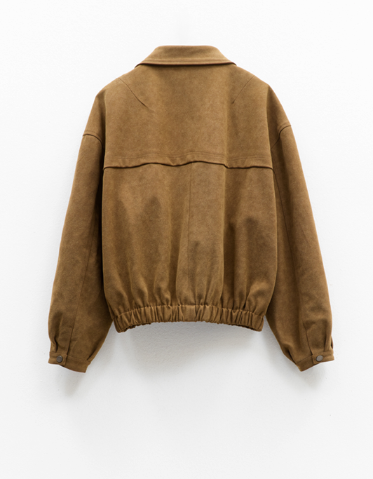 Bomber jacket crafted from soft cotton with a suede-effect finish, featuring a relaxed fit and elasticated hem that defines the shape. It comes with a classic collar, front zip fastening, and discreet welt pockets. Fully lined for comfort and structure, it blends utilitarian style with timeless urban sophistication.