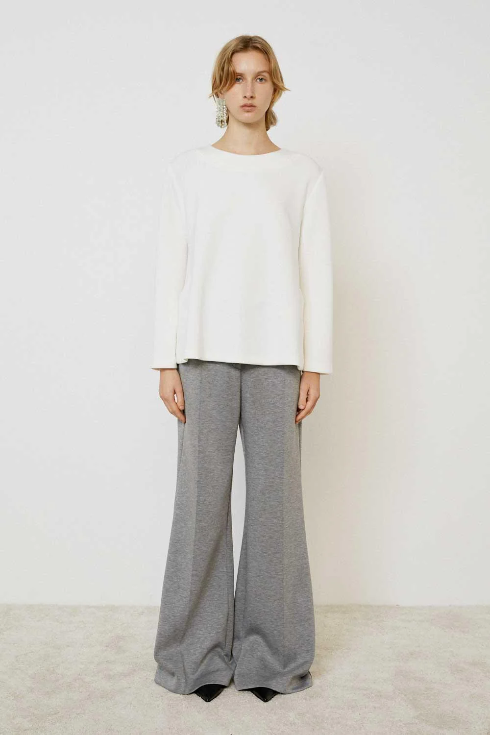 Tailored flared trousers with a refined, elongated silhouette. Designed with side pockets, front zip and button fastening, and structured pleats for a polished finish. The soft stretch viscose-blend fabric provides comfort and fluidity while maintaining a contemporary shape.