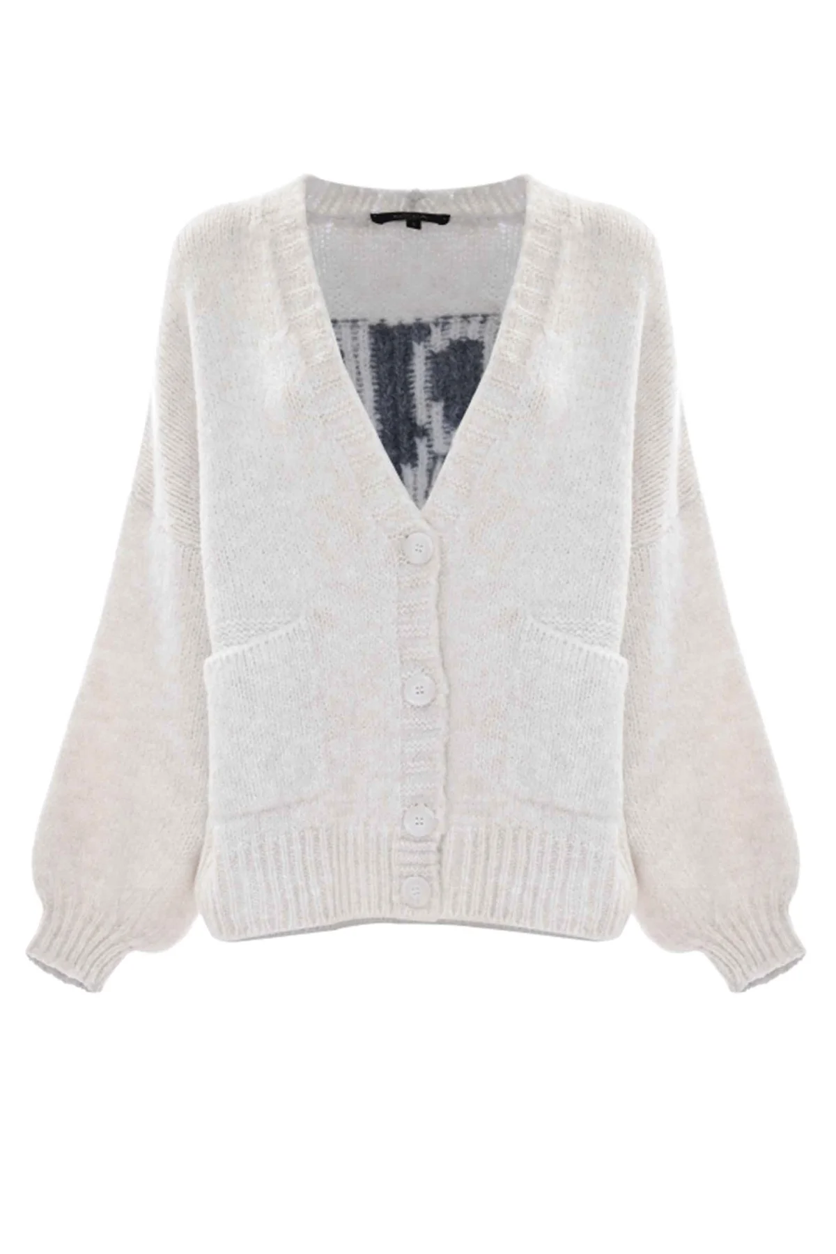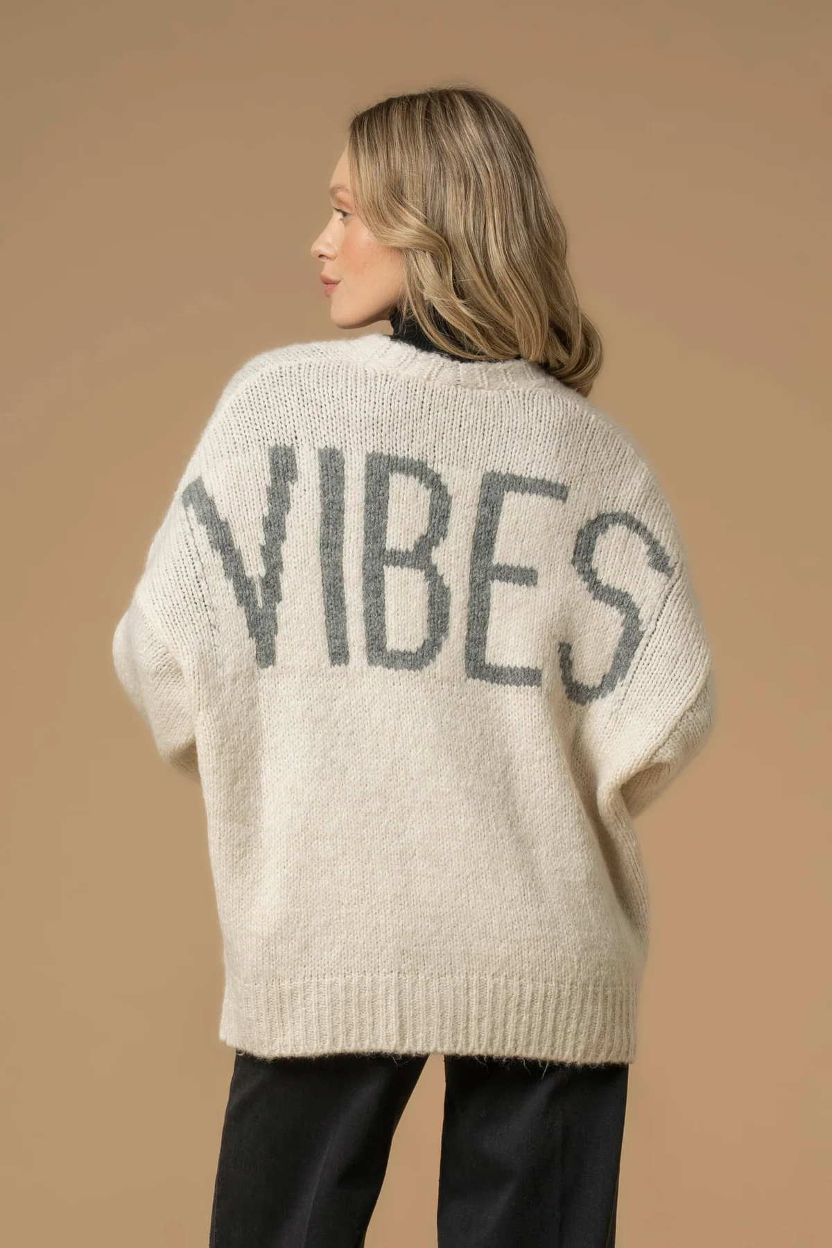 Cosy and full of personality, the “VIBES” cardigan by Kocca blends comfort with a modern statement. Crafted from a soft mohair-blend knit, it features a deep V-neckline, front button closure, patch pockets, and a bold “VIBES” jacquard lettering on the back — the perfect mix of ease and attitude.