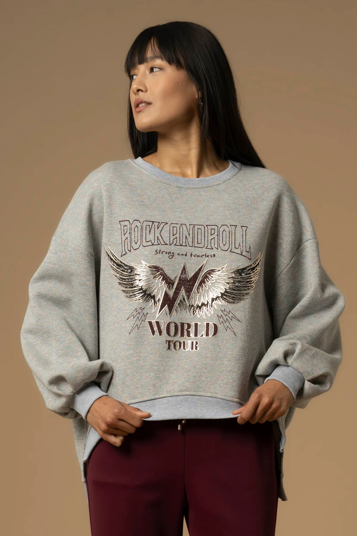 Embrace retro attitude with this oversized Kocca sweatshirt, featuring metallic Rock and Roll World Tour lettering and winged artwork for a bold, 80s-inspired look. The relaxed fit, crew neckline, and ribbed finishes make it a perfect everyday statement piece.