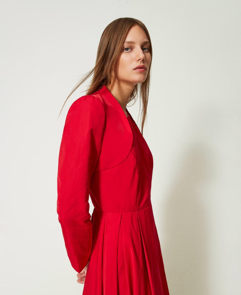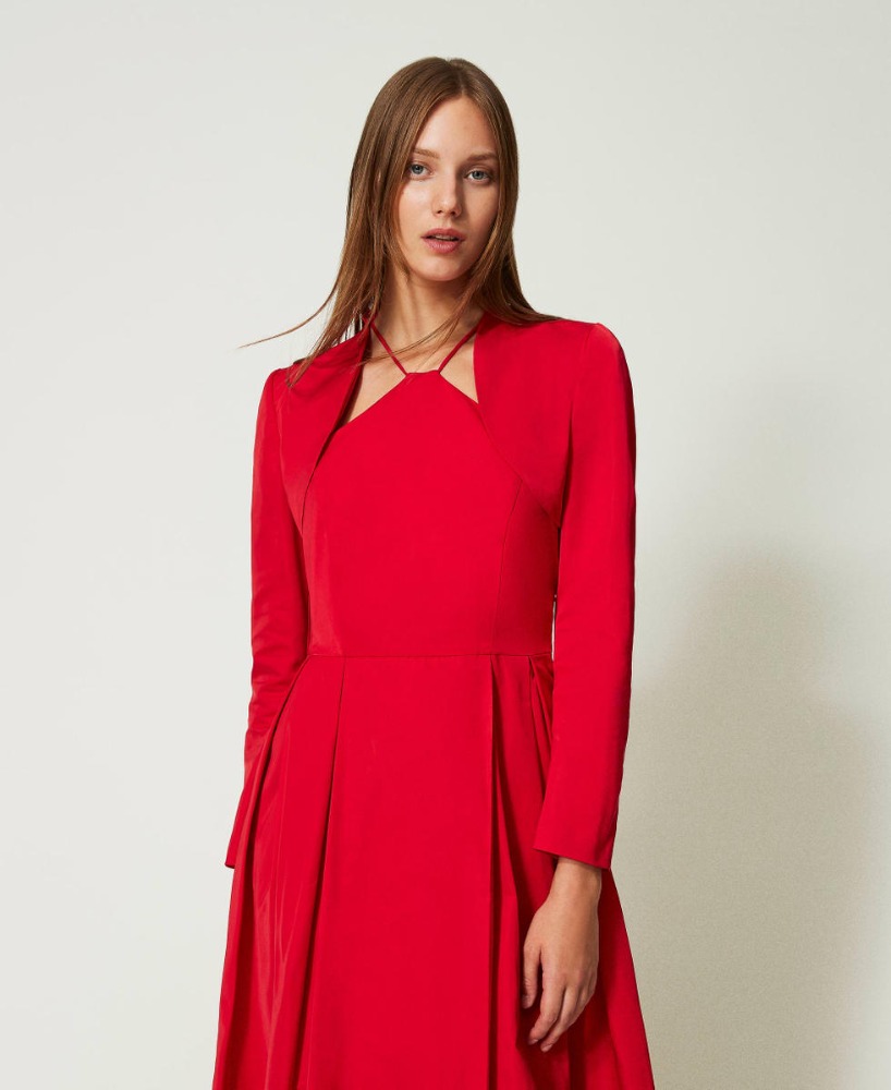Conjunto elegante da linha Twinset Evening, em tafetá vermelho luminoso. O vestido longo apresenta um corte fluido com decote halter e cintura marcada, enquanto a casaca curta coordenada acrescenta estrutura e um acabamento de inspiração couture.