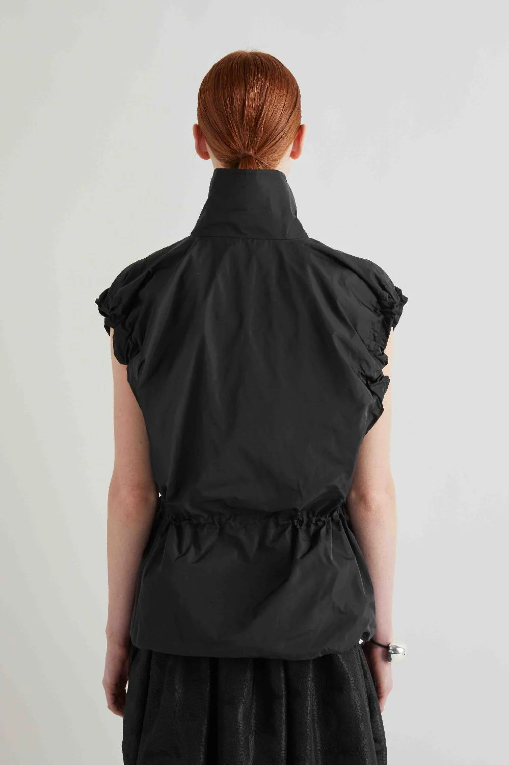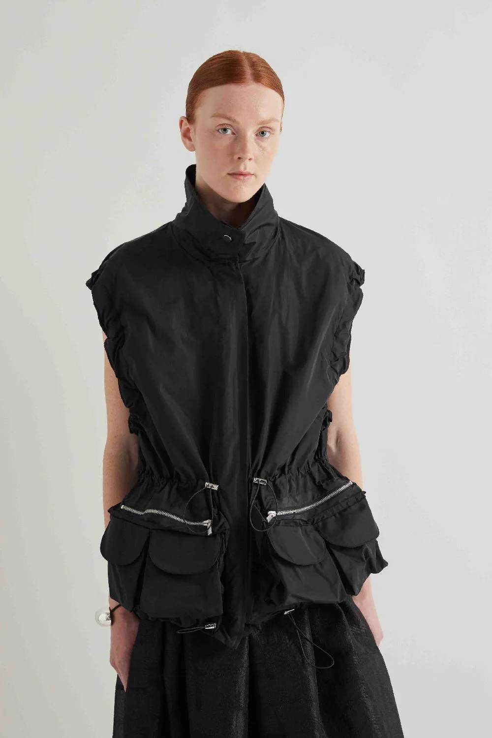 Modern and utilitarian, this lightweight taffeta vest stands out for its subtle volume, technical texture and functional detailing.