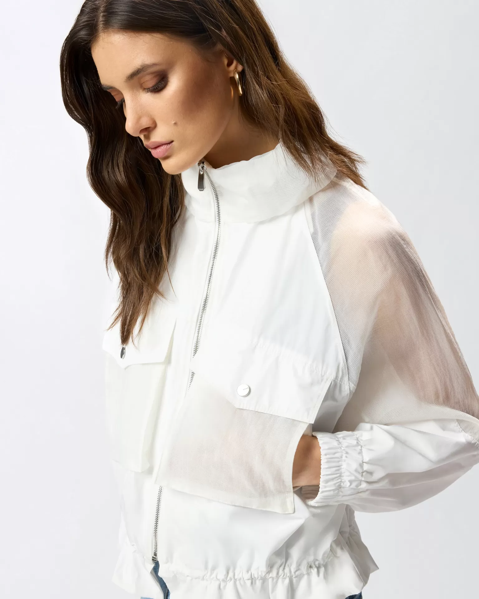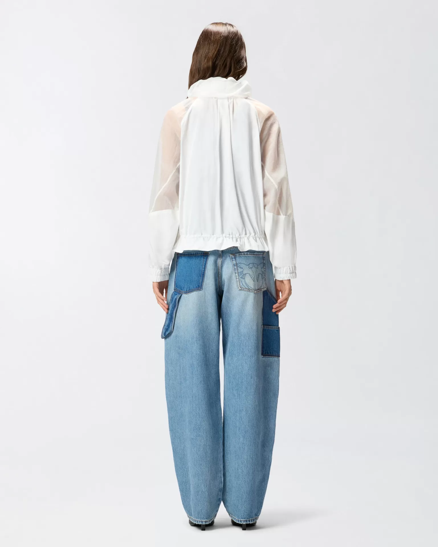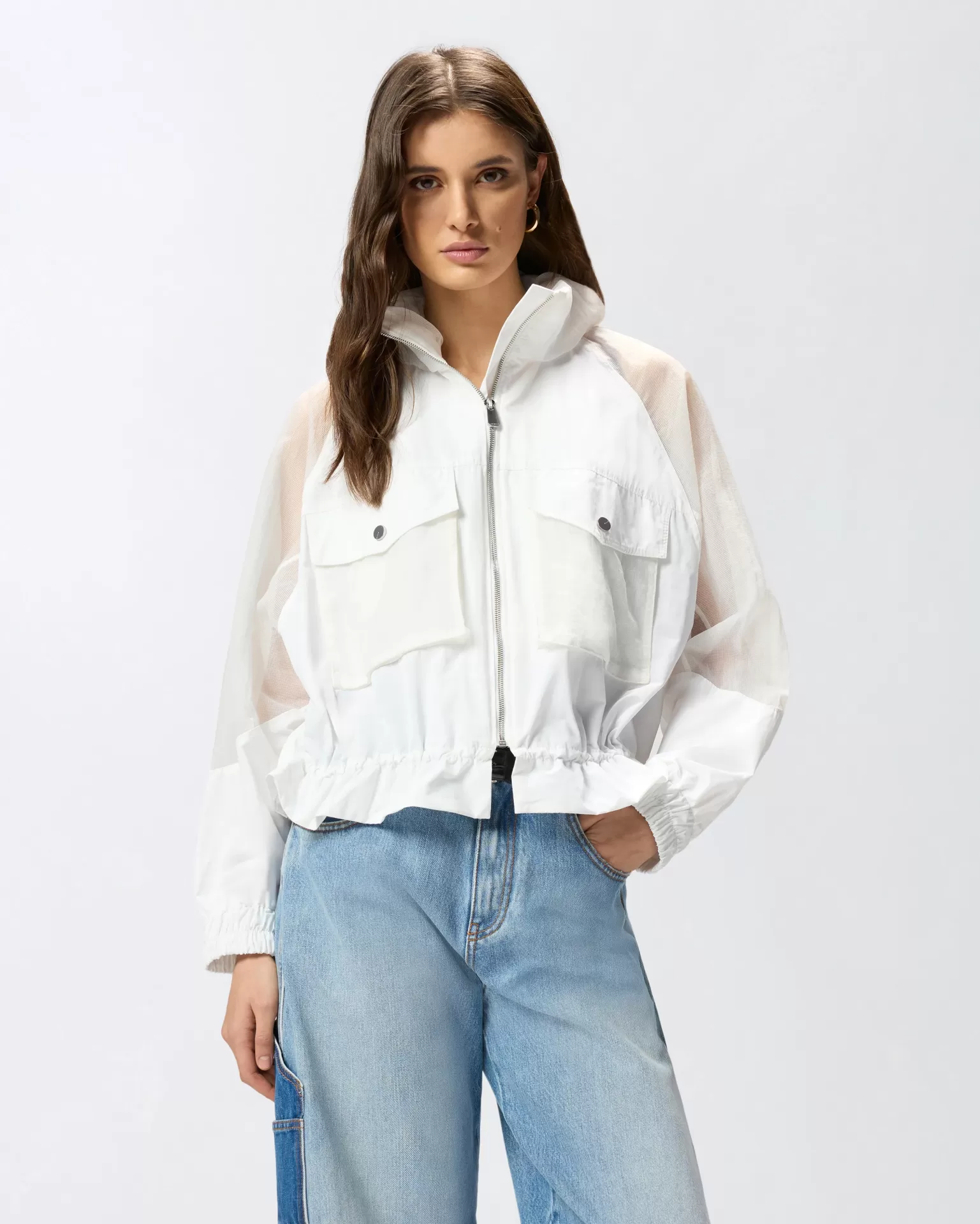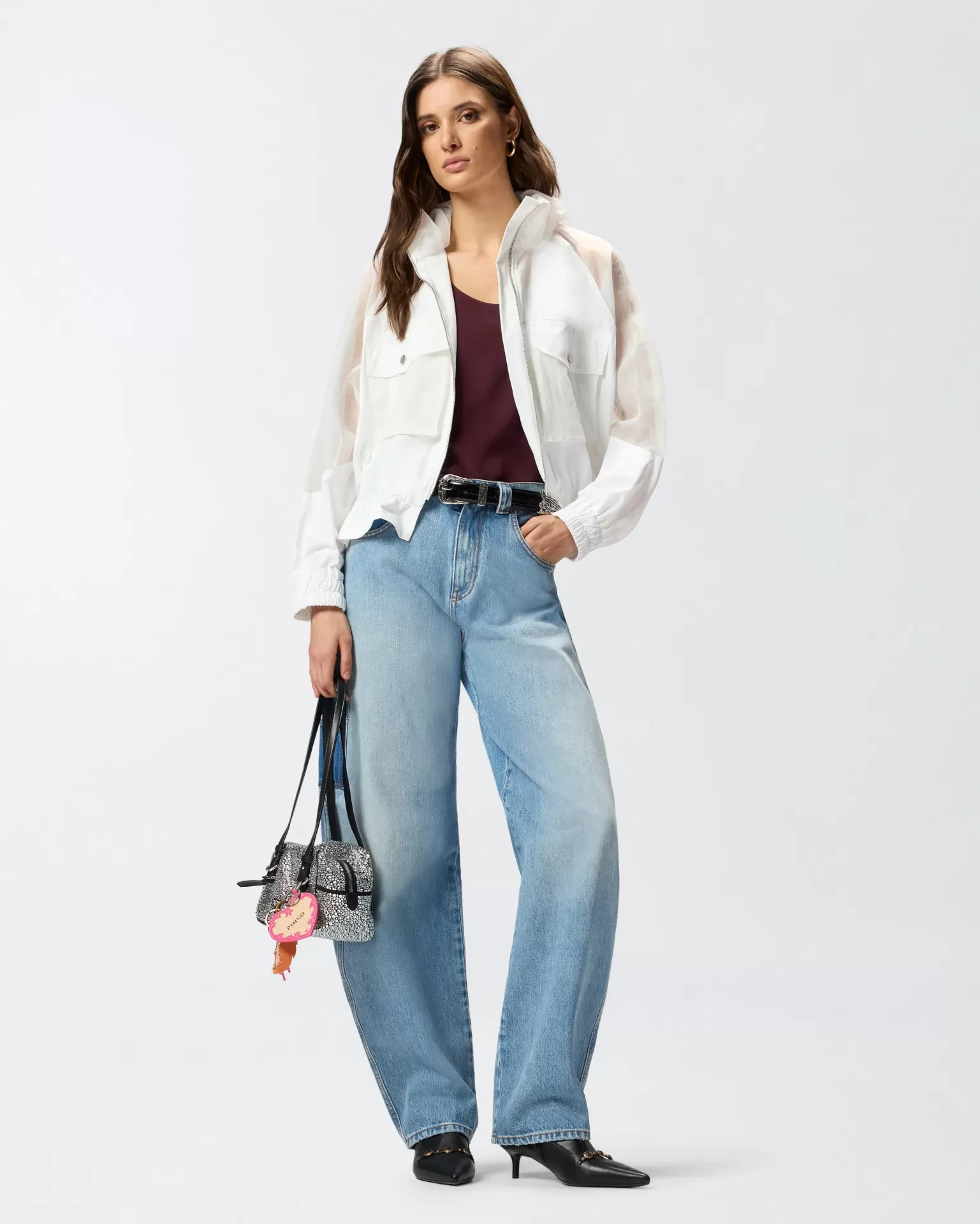 The Beth bomber jacket by PINKO reworks a wardrobe classic with a modern technical twist. Crafted from taffeta-effect technical canvas, it features organza ripstop inserts on the sleeves, collar and pockets, creating a subtle contrast between durability and sheer transparency. A stand-up collar adds extra protection, while raglan sleeves and elasticated cuffs deliver comfort and ease of movement. Finished with front gusset pockets with flap and button, a zip fastening and an internal adjustable drawstring at the hem for a more defined, functional yet feminine silhouette.