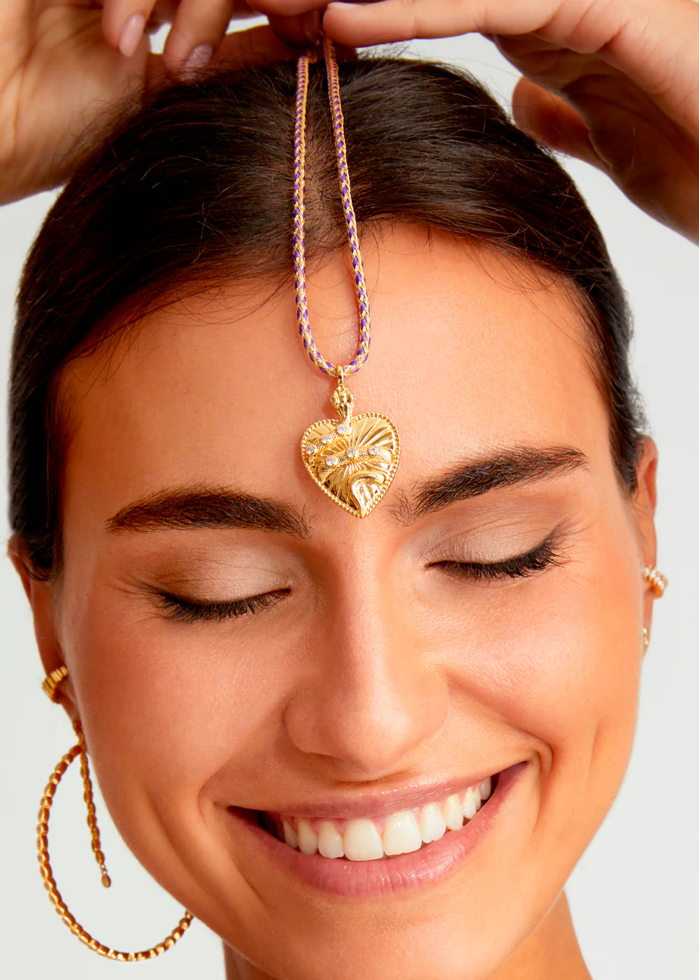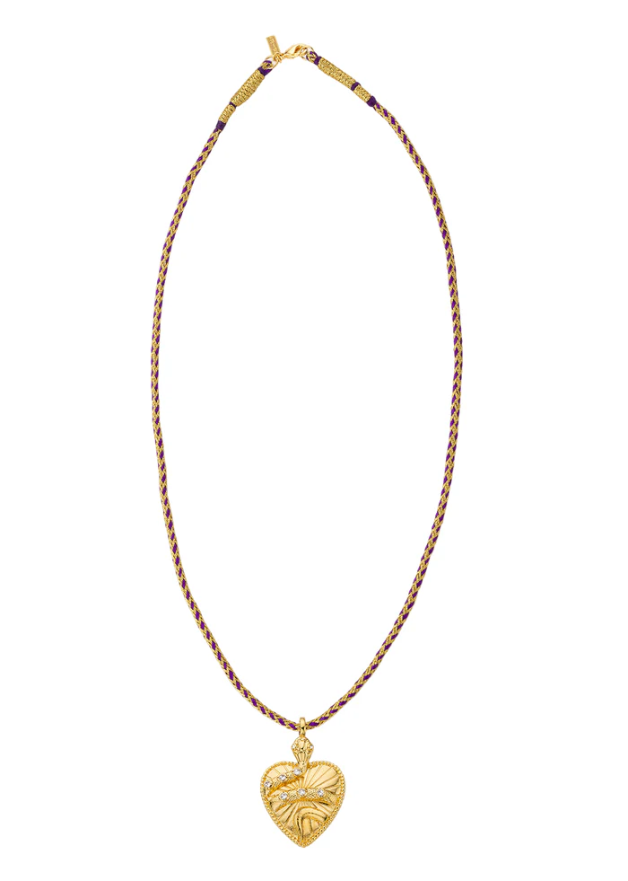 Um coração envolto por uma serpente: drama, paixão e aquele toque de perigo elegante que torna tudo mais interessante. O pendente dourado é detalhado e texturado, enquanto o cordão roxo — tecido à mão na Índia — acrescenta um contraste vibrante e ultra-moderno. Uma peça statement com simbolismo forte: amor intenso, decidido e absolutamente inesquecível.