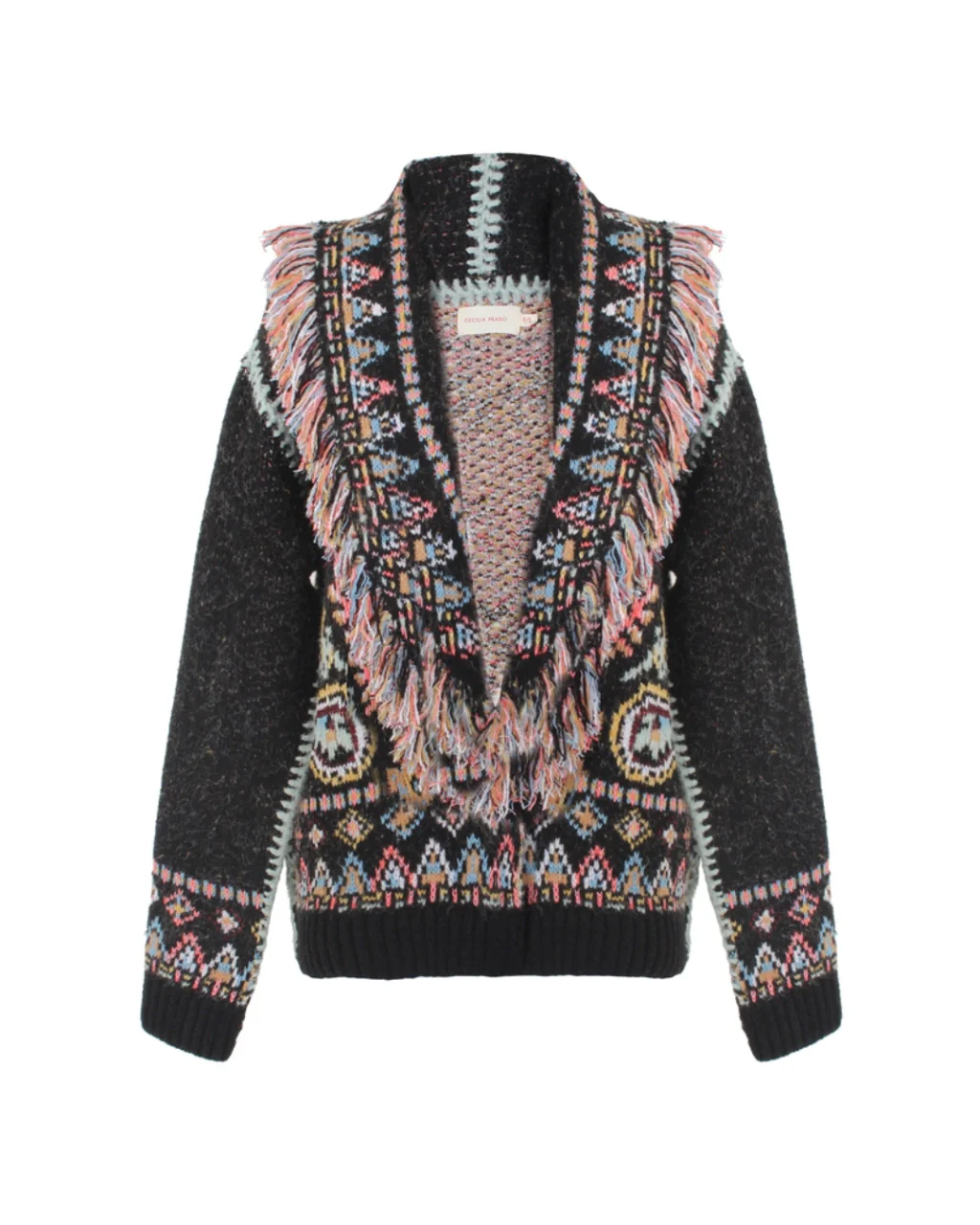 The wide fringed collar adds movement and character, while the soft knit ensures warmth and comfort during cooler days. A versatile, statement piece designed to elevate any autumn or winter look.