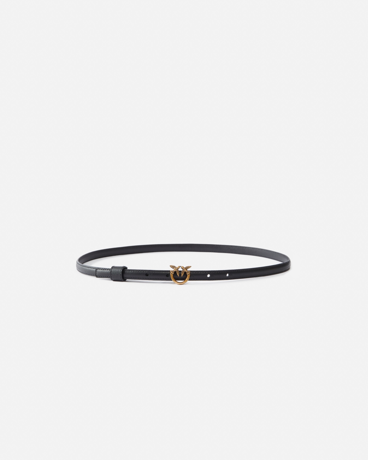 Cinto fino em pele lisa com a icónica fivela Love Birds Diamond Cut em metal dourado envelhecido ou prateado antigo.