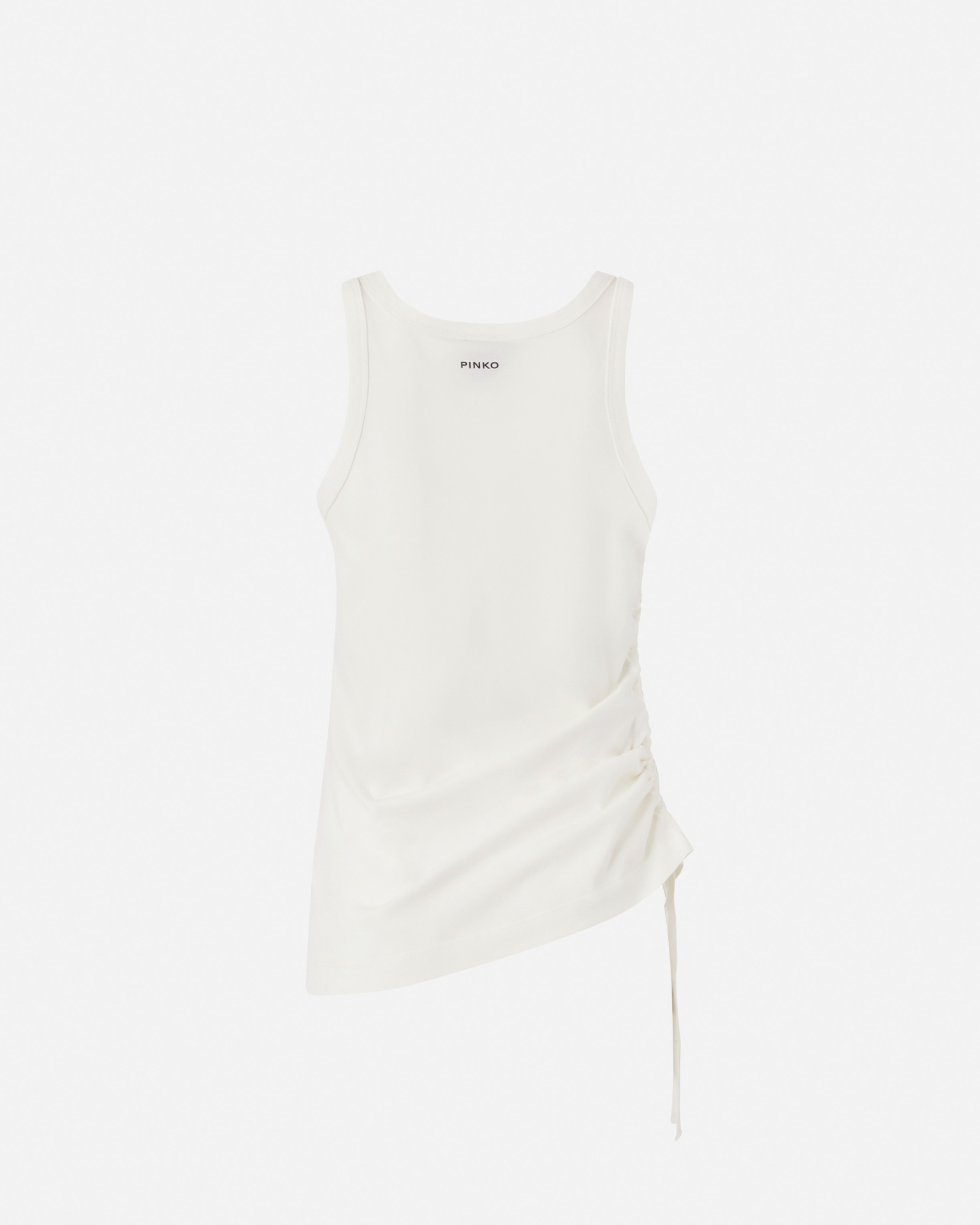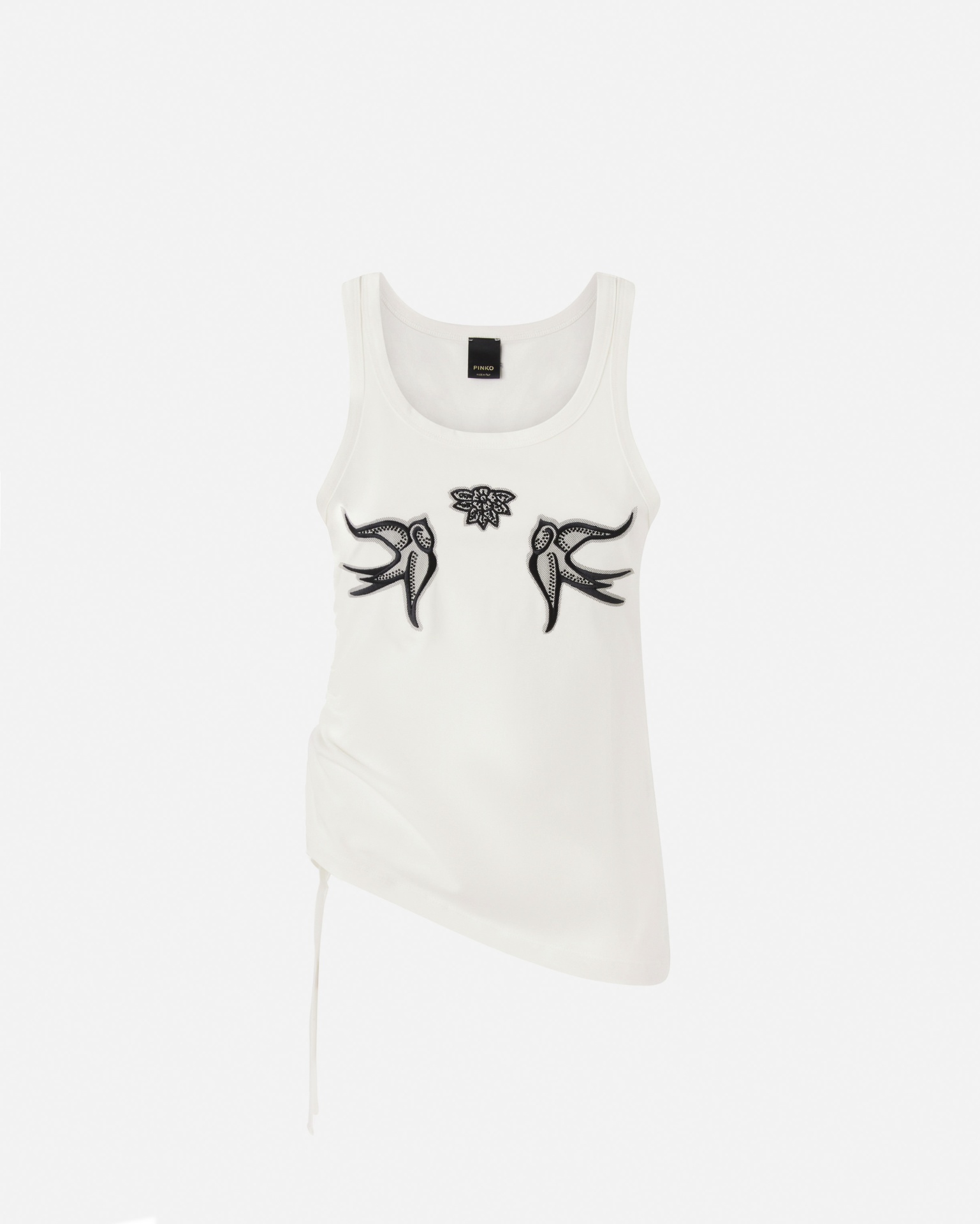 Cotton jersey tank top with a deep round neckline and fitted silhouette. The front features micro-mesh embroidery of the iconic Love Birds logo, symbolising PINKO’s spirited and feminine aesthetic. The asymmetric hem with adjustable drawstring adds a touch of originality and movement, making it a modern essential to pair with jeans, skirts, or cargo trousers.