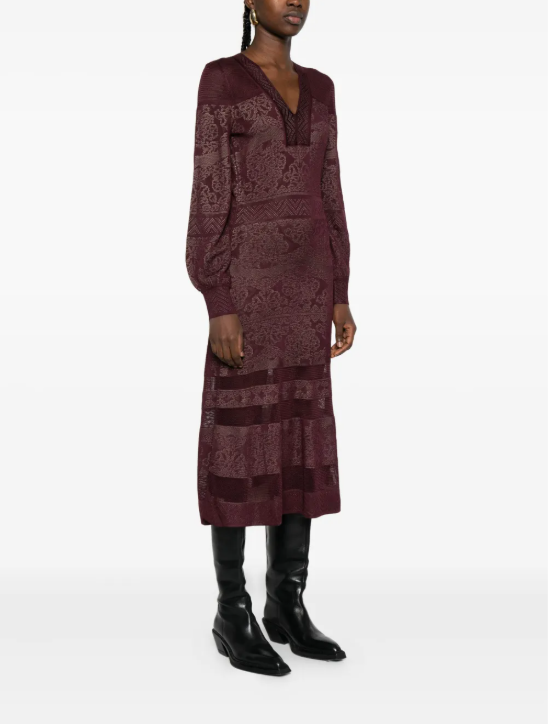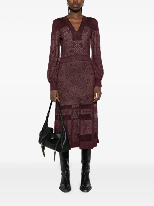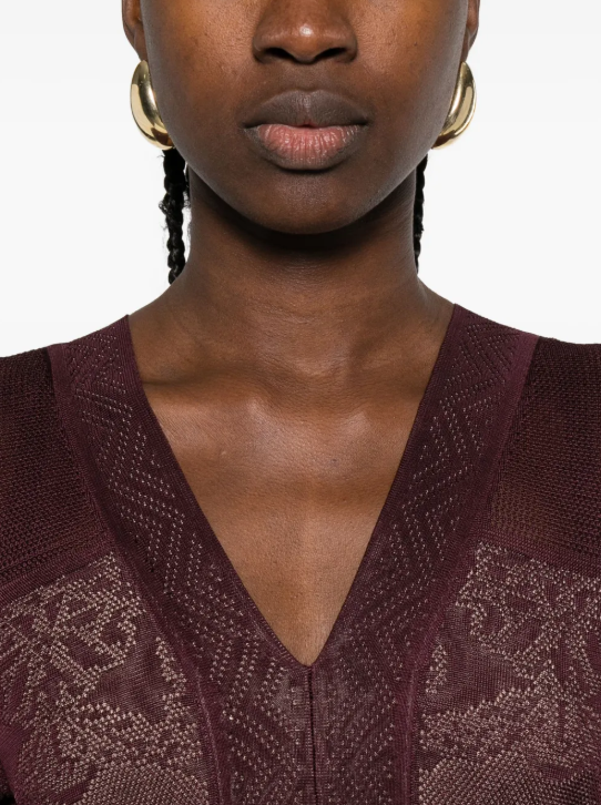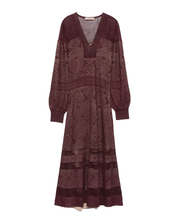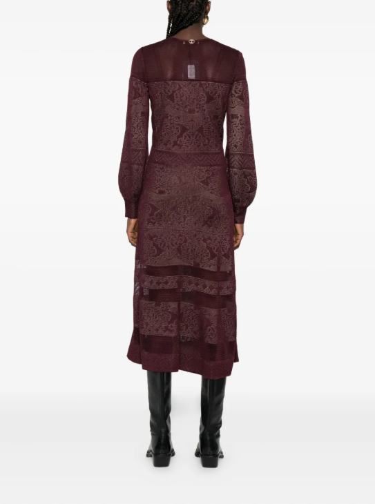 This deep wine red jacquard knit maxi dress by TWINSET features an intricate textured pattern, a flattering V-neckline, and long balloon sleeves. The semi-sheer panels at the hem add movement and a touch of sensuality, while the fluid silhouette gently follows the body, combining comfort and refinement.