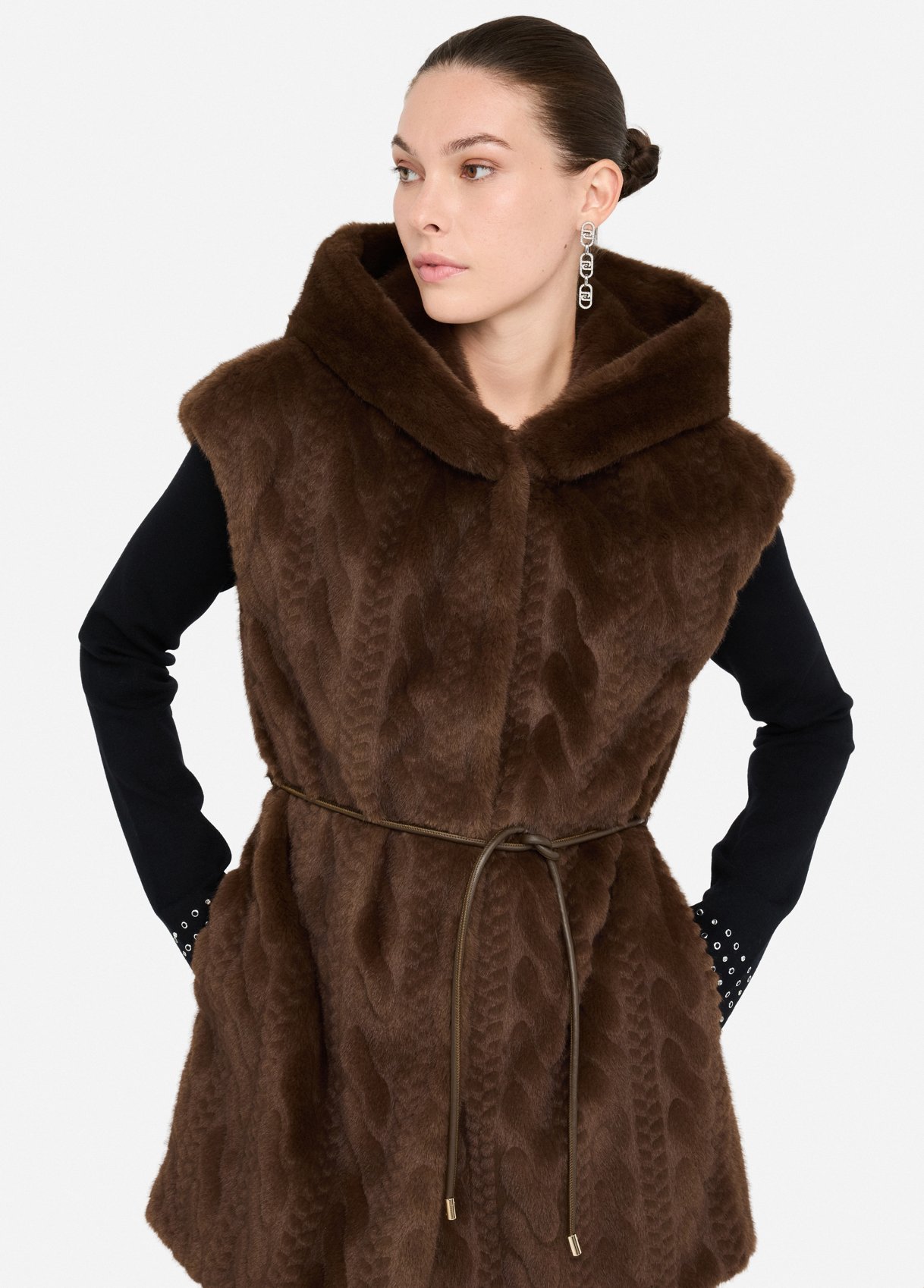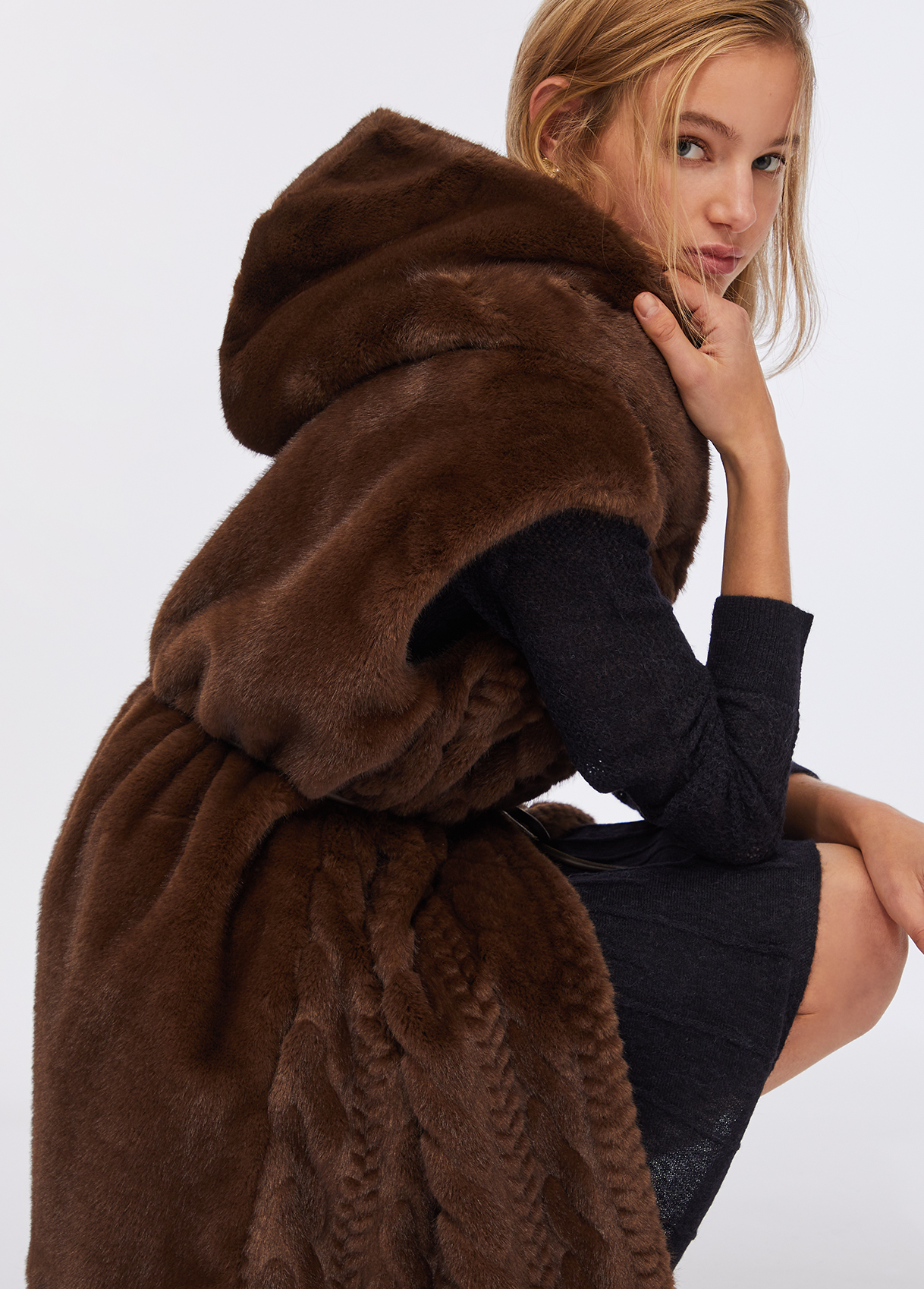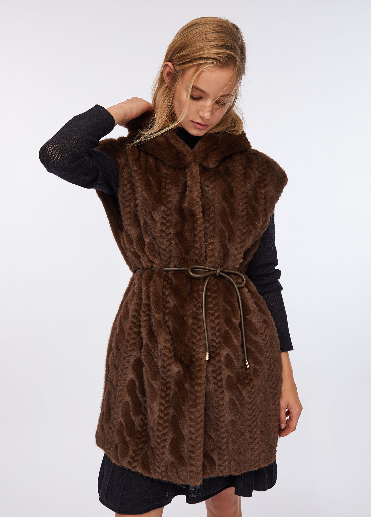 Soft faux fur vest featuring a cable-knit effect on the front, an enveloping hood, side pockets, and hidden snap fastening. The tonal belt defines the waist, creating a refined and cosy silhouette that blends comfort and sophistication — the ultimate layering piece for the cold season.
