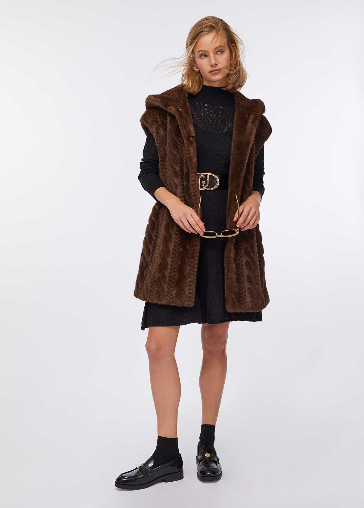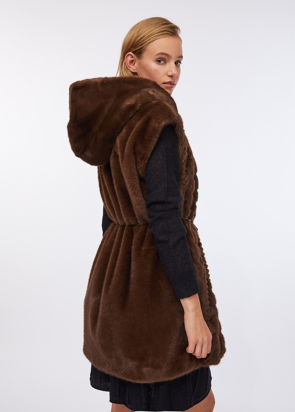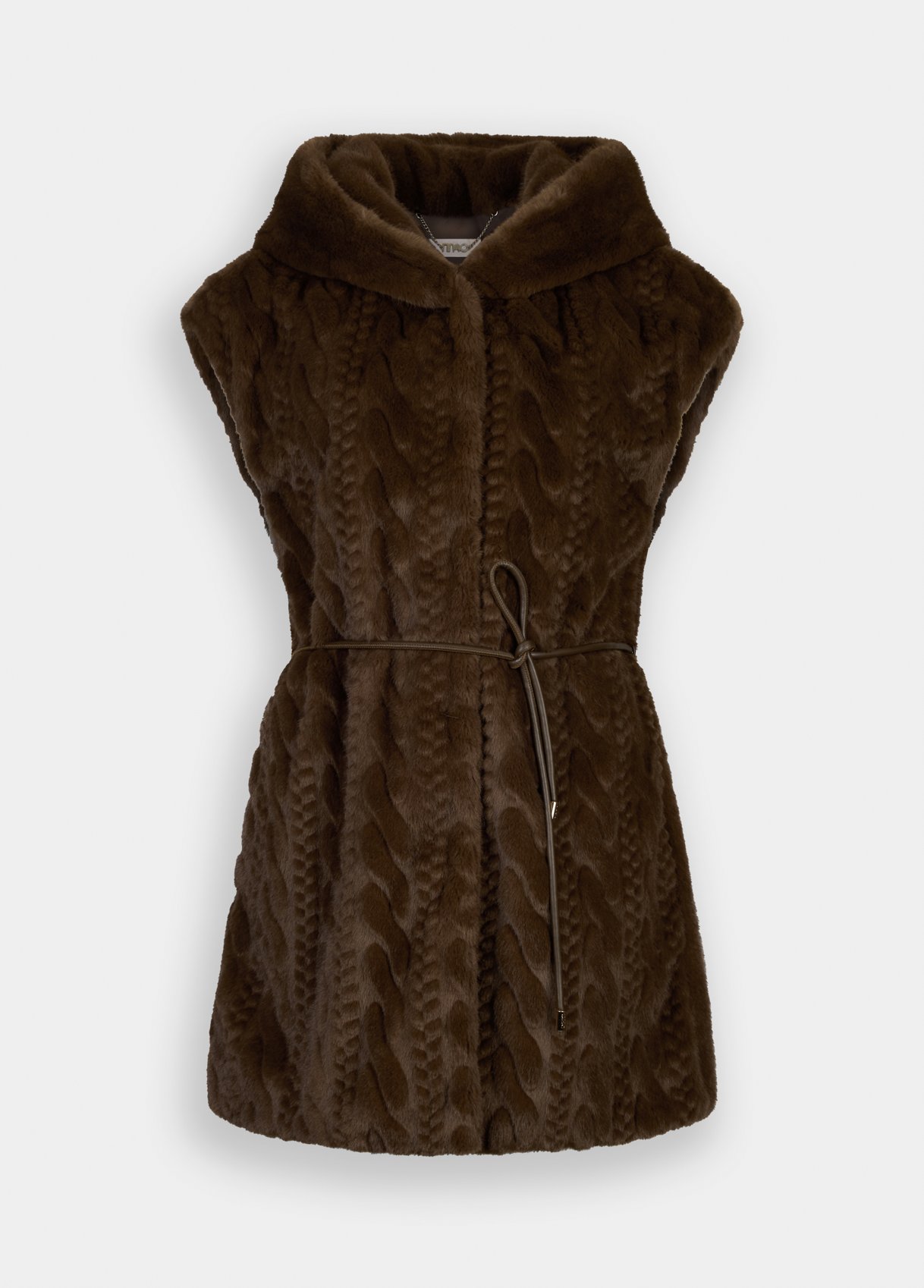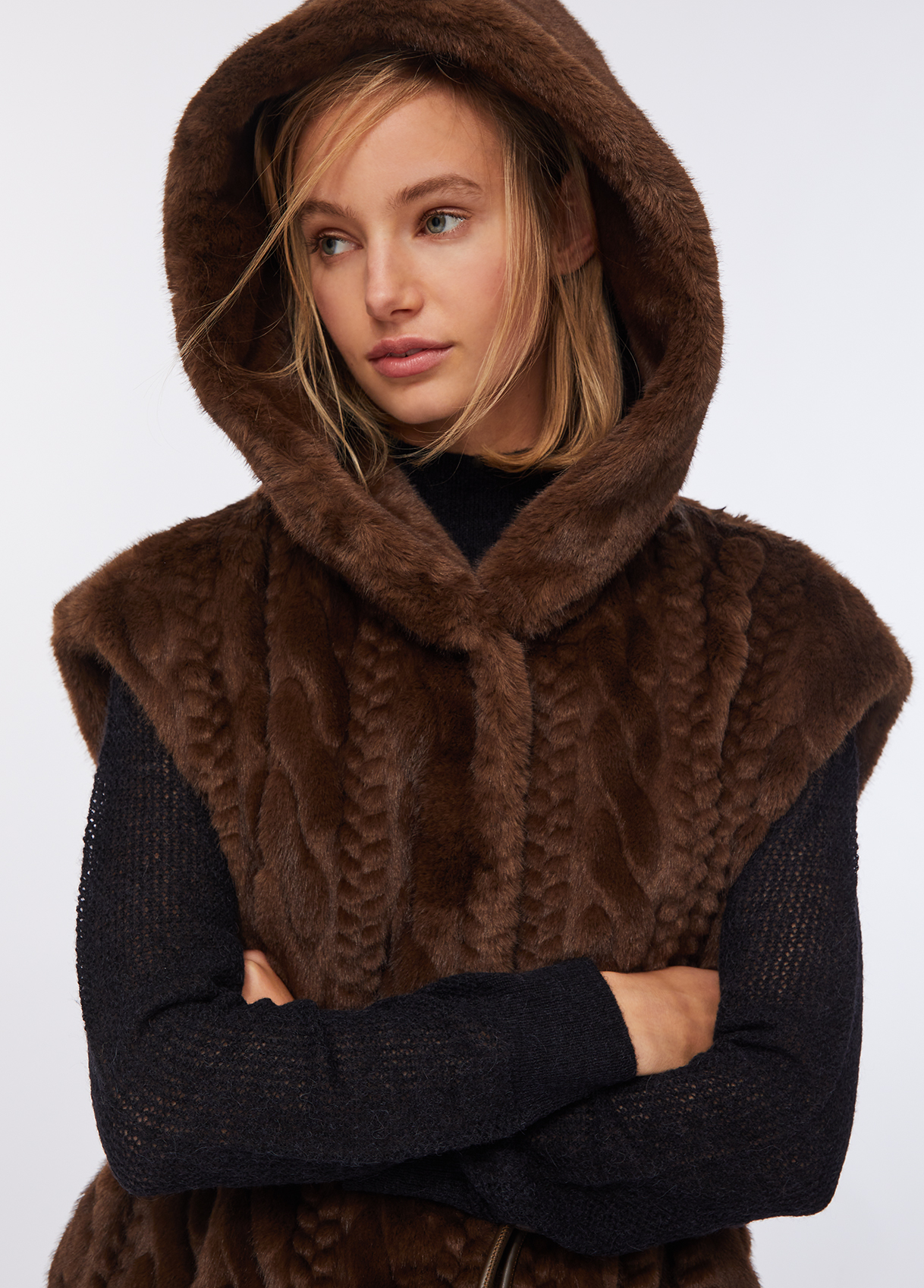 Soft faux fur vest featuring a cable-knit effect on the front, an enveloping hood, side pockets, and hidden snap fastening. The tonal belt defines the waist, creating a refined and cosy silhouette that blends comfort and sophistication — the ultimate layering piece for the cold season.