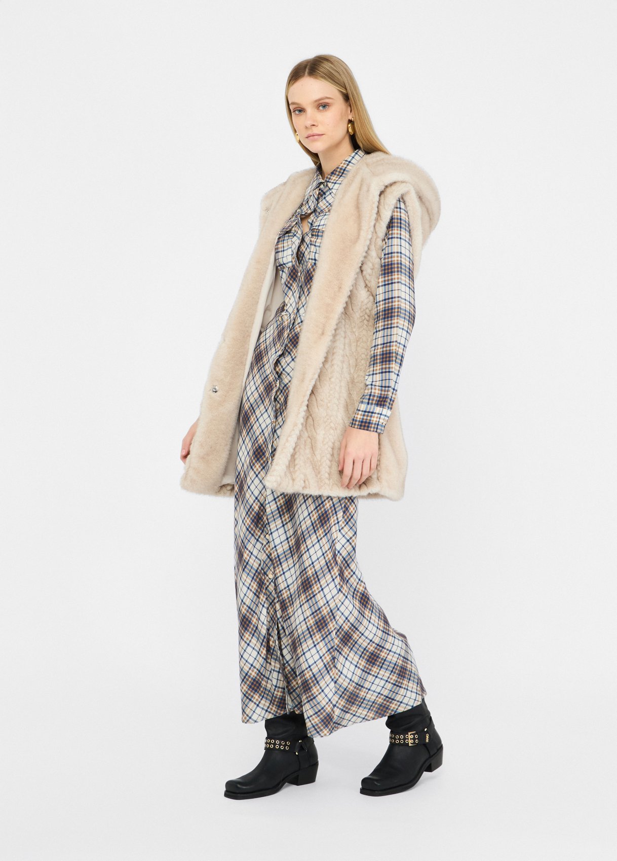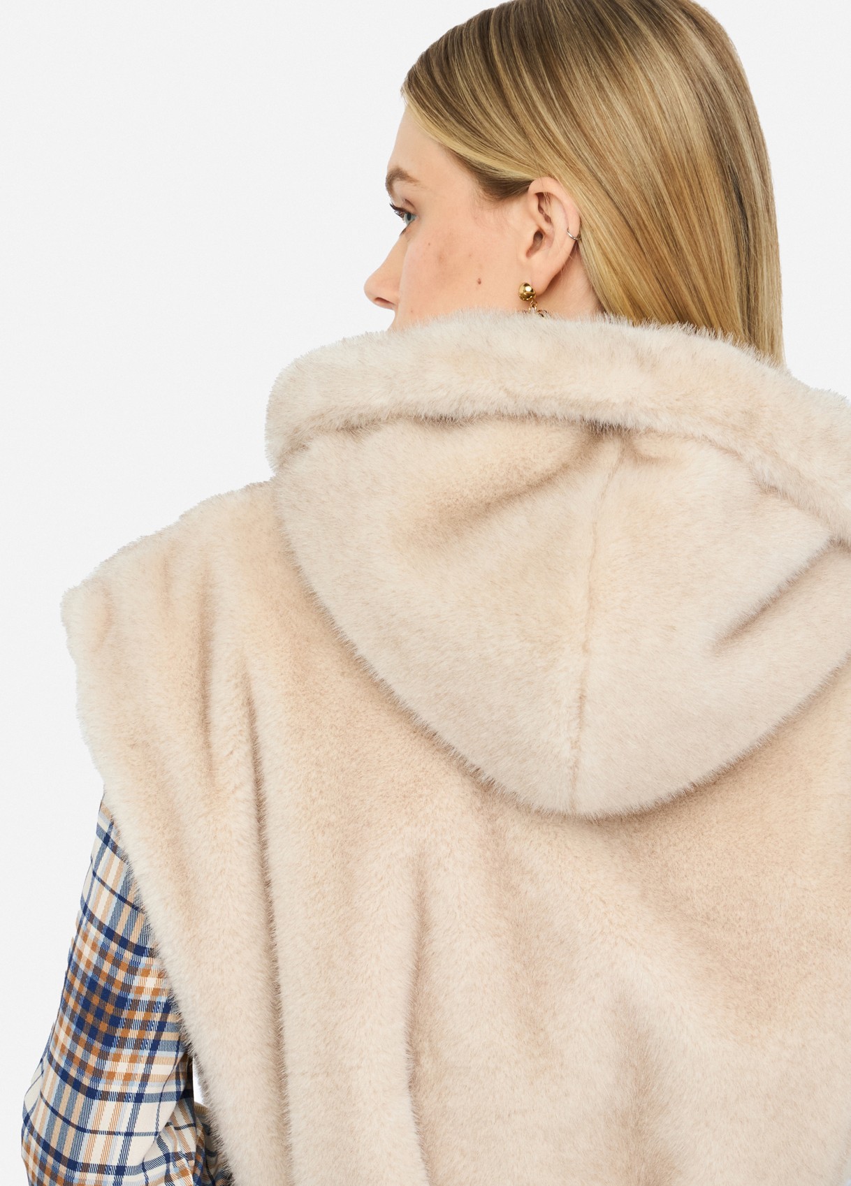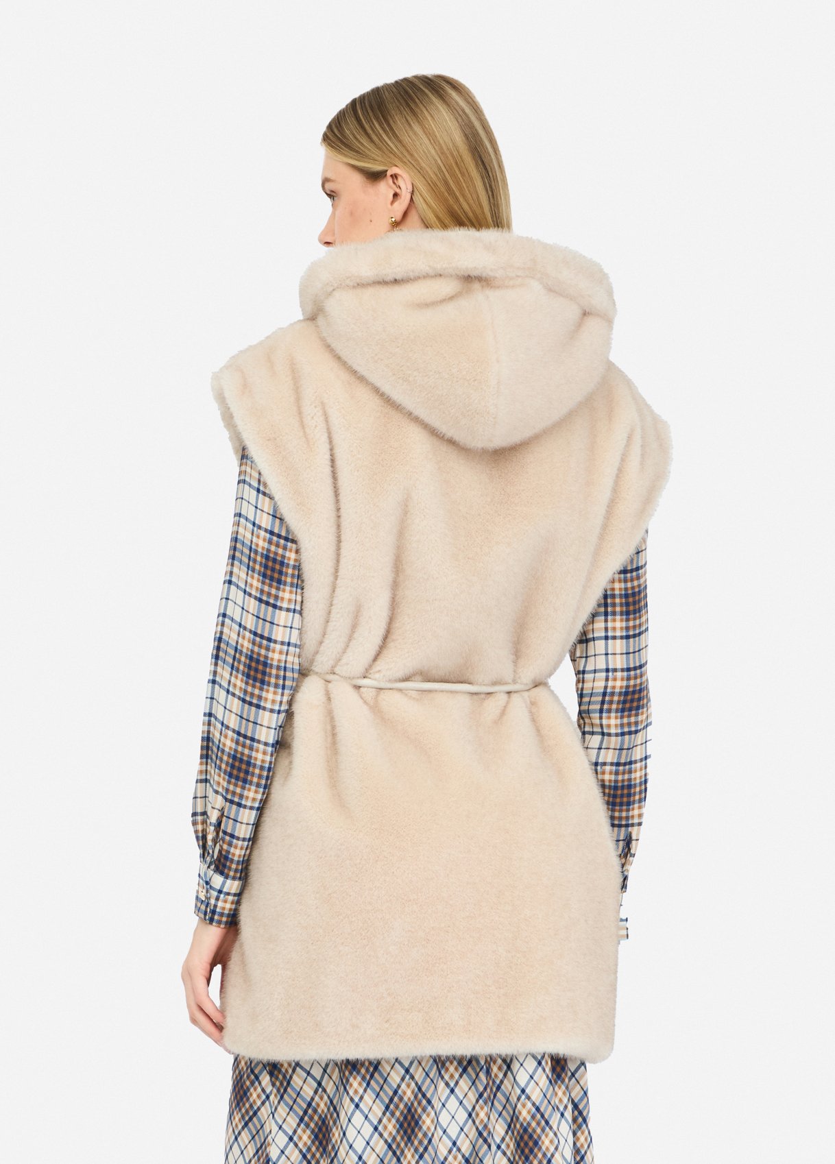 Beige faux-fur vest — soft texture and elevated comfort.