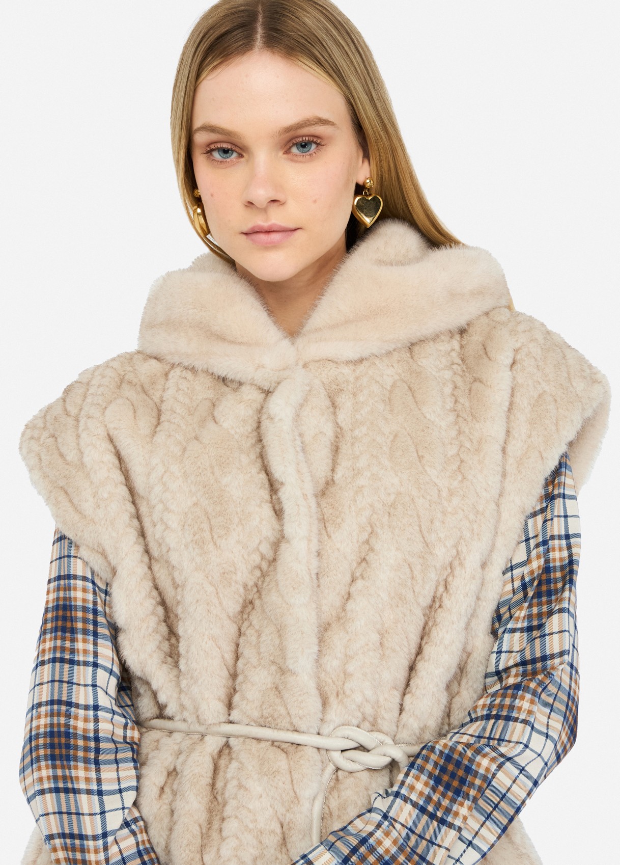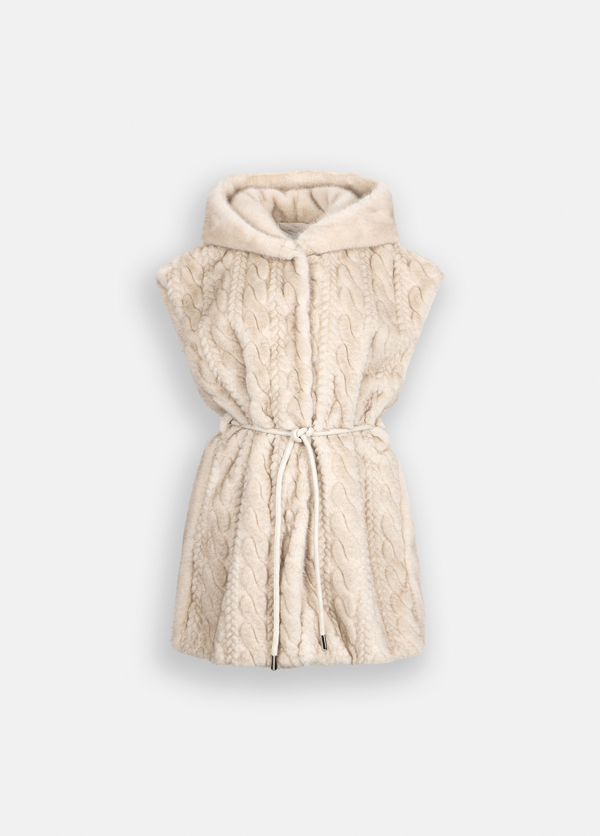 Soft beige faux-fur vest featuring a cable-knit effect on the front, a cozy hood, and a matching adjustable belt. Its clean snap fastening and subtle texture bring together comfort, warmth, and minimal elegance. Designed for layering, this piece embodies the quiet sophistication that defines raquelprates.com.
