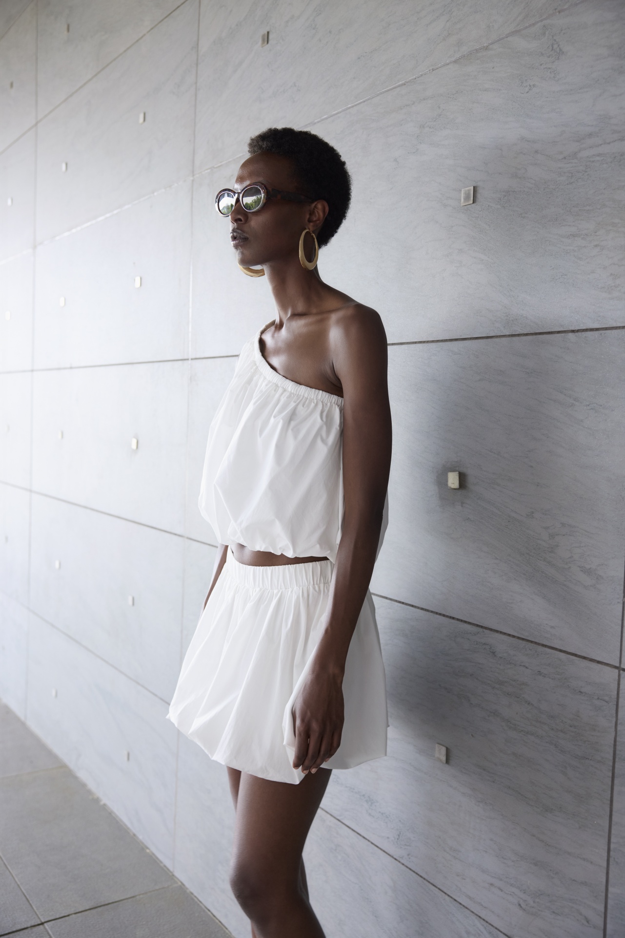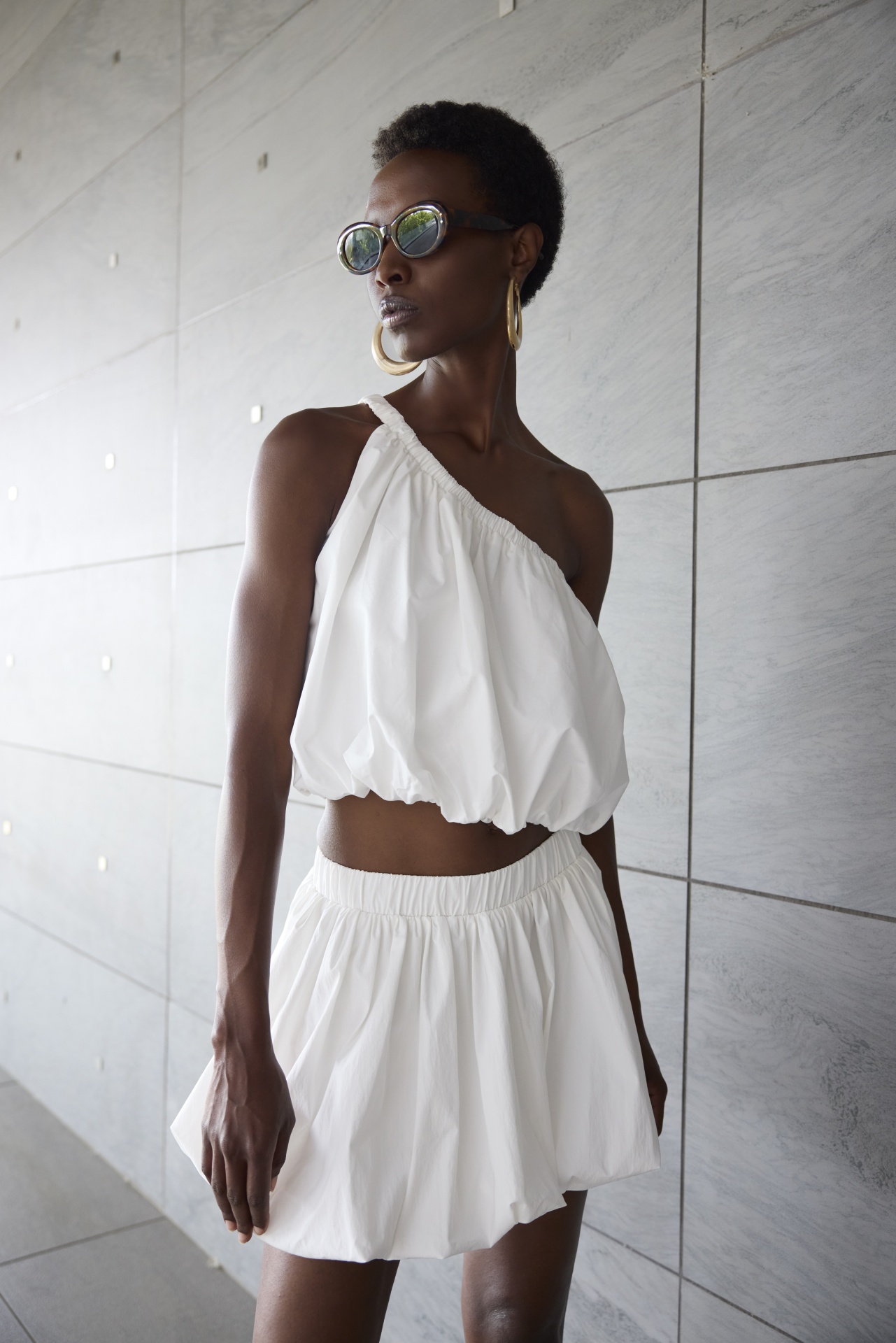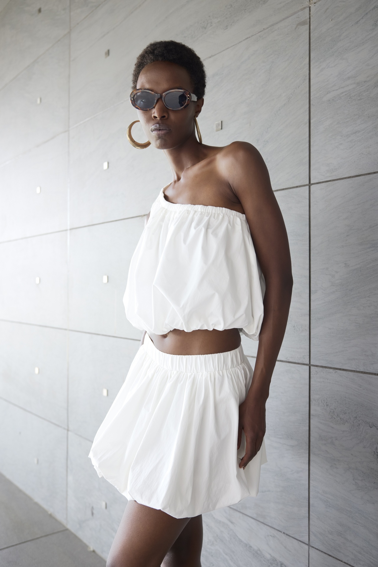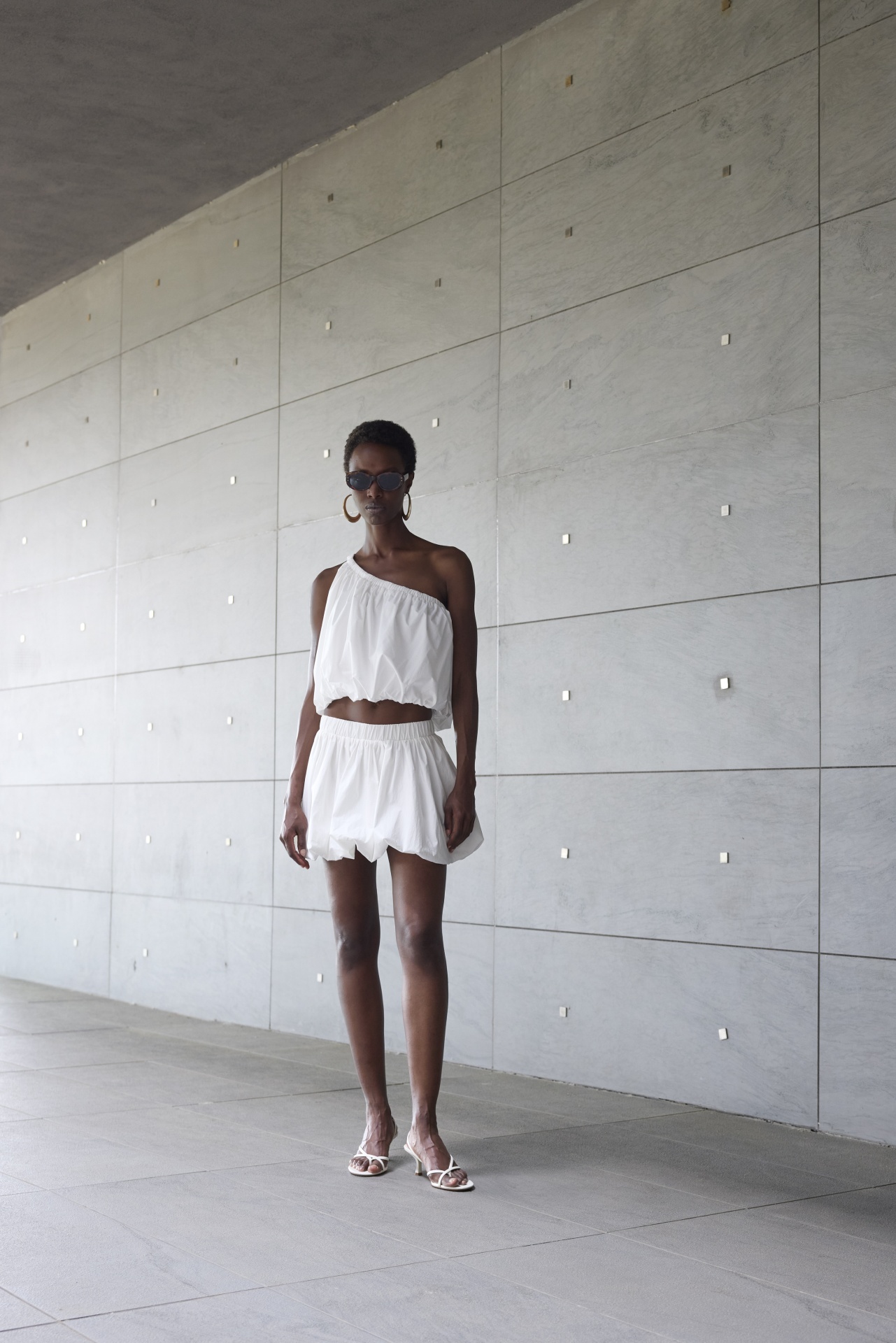 This white cropped top stands out for its balloon construction and sculptural silhouette. Featuring a single shoulder strap, it creates an elegant asymmetric line that enhances the shoulders while adding immediate modernity to the look. Crafted from 100% cotton with lining, it balances structure and lightness, making it a statement piece for Spring/Summer 2026.