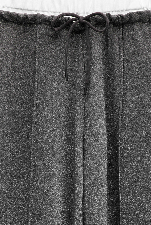 Calças largas em jersey técnico com textura cintilante e cintura elástica contrastante em branco, ajustável com cordão. O tecido misto de poliéster, algodão e elastano garante conforto, fluidez e um toque sofisticado, ideal para um visual despretensiosamente elegante.