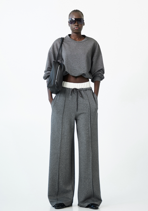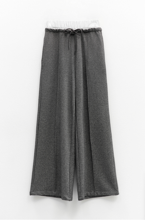 Wide-leg trousers in shimmering technical jersey with a white elastic waistband and adjustable drawstring. The soft polyester–cotton–elastane blend offers comfort, structure and effortless sophistication — perfect for modern, elevated loungewear looks.