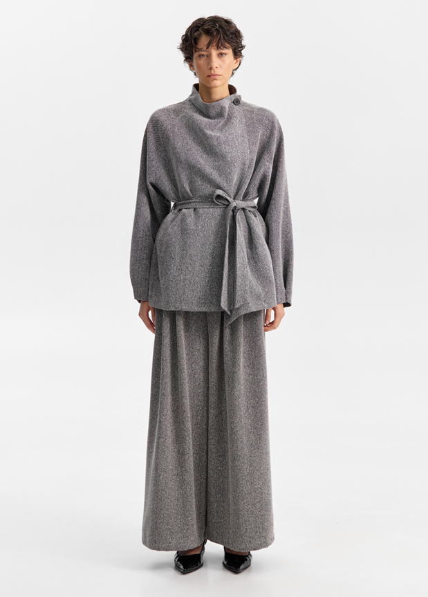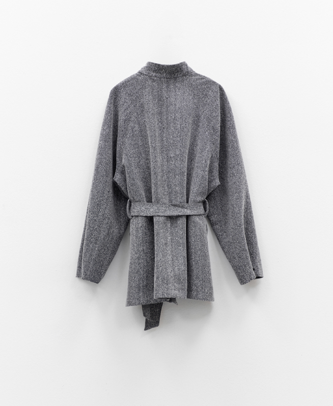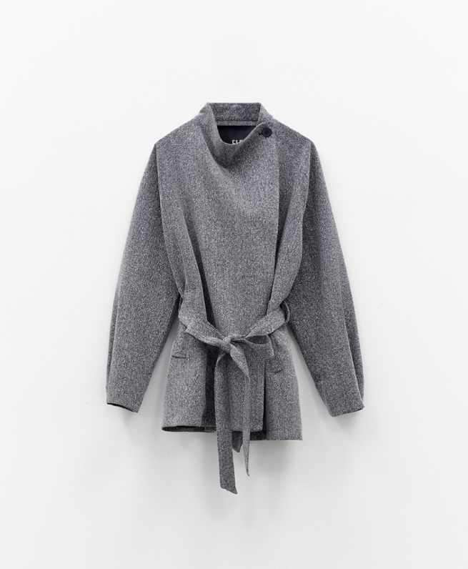 Jacket in a cotton and polyester blend with a soft wool feel, combining comfort and structure in a minimalist, refined design. Features an asymmetric high collar with side button closure, wide sleeves, and a matching belt that subtly defines the waist. The smooth texture and relaxed silhouette make it perfect for effortlessly elegant urban looks.