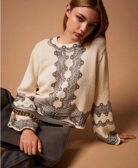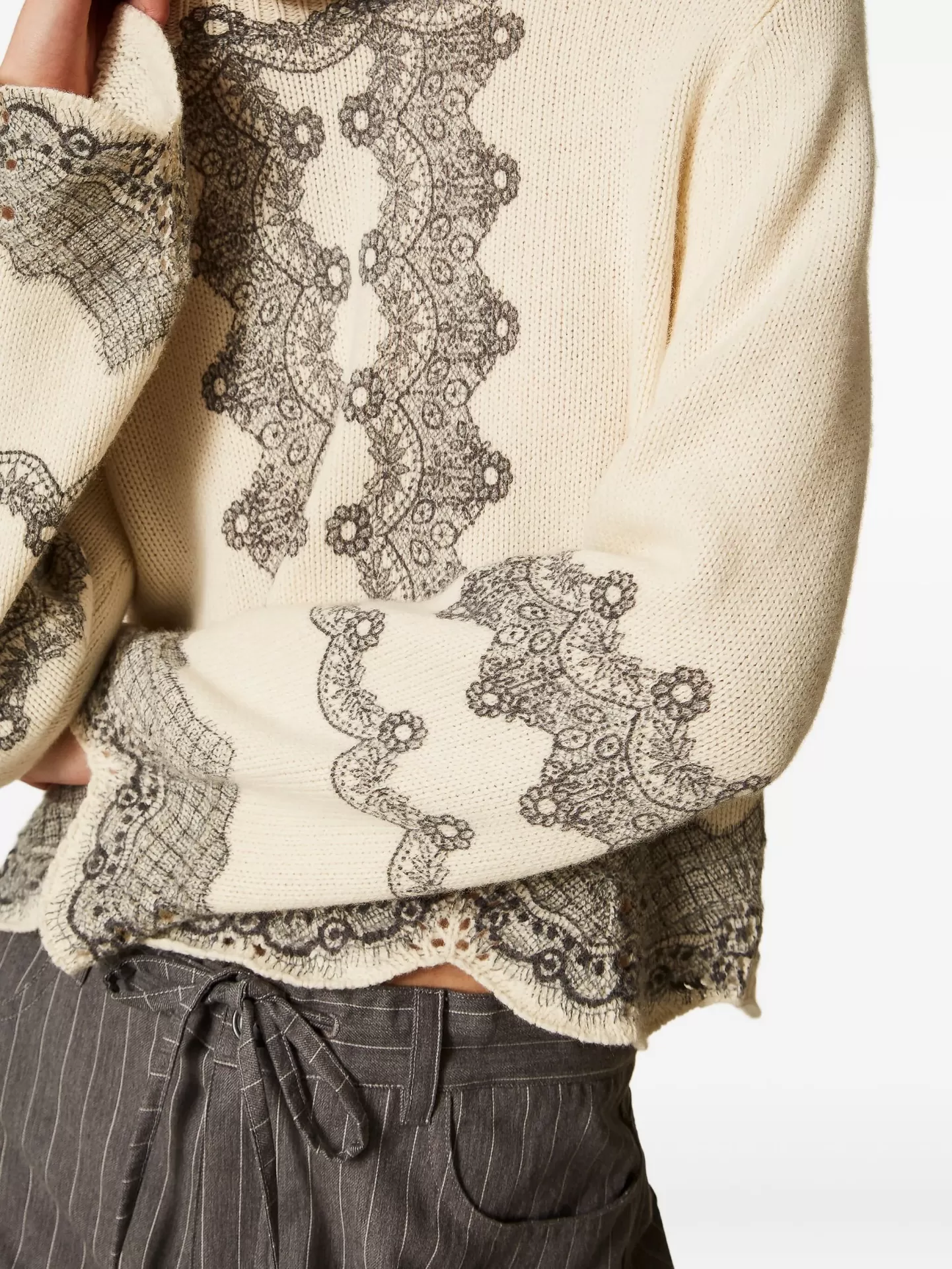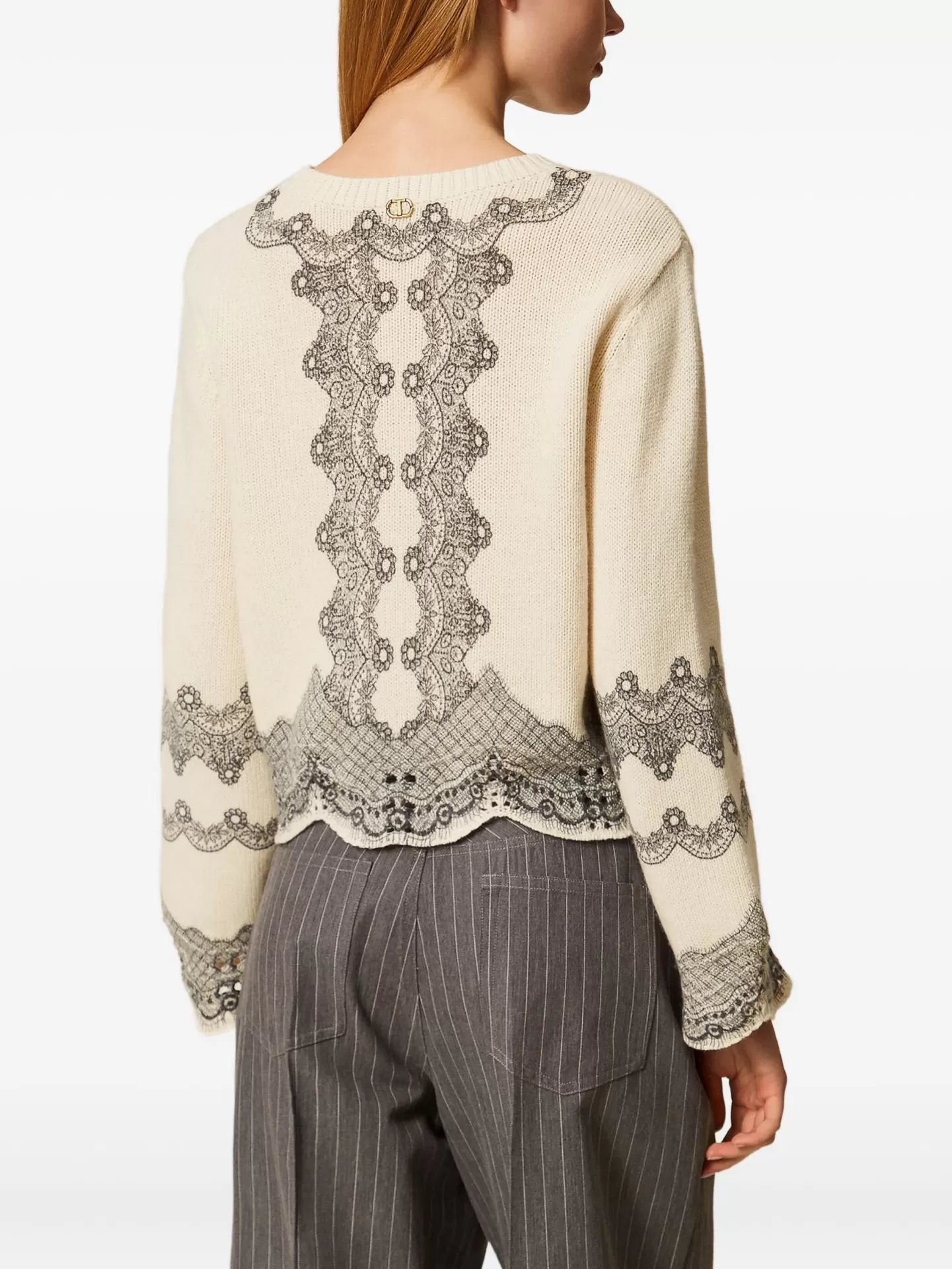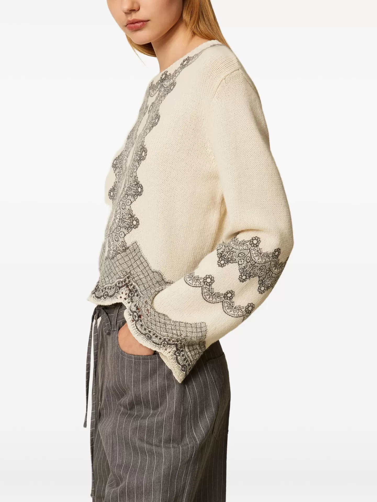 Wool and cotton blend jumper featuring a placed black lace-effect print on a snow-white base.